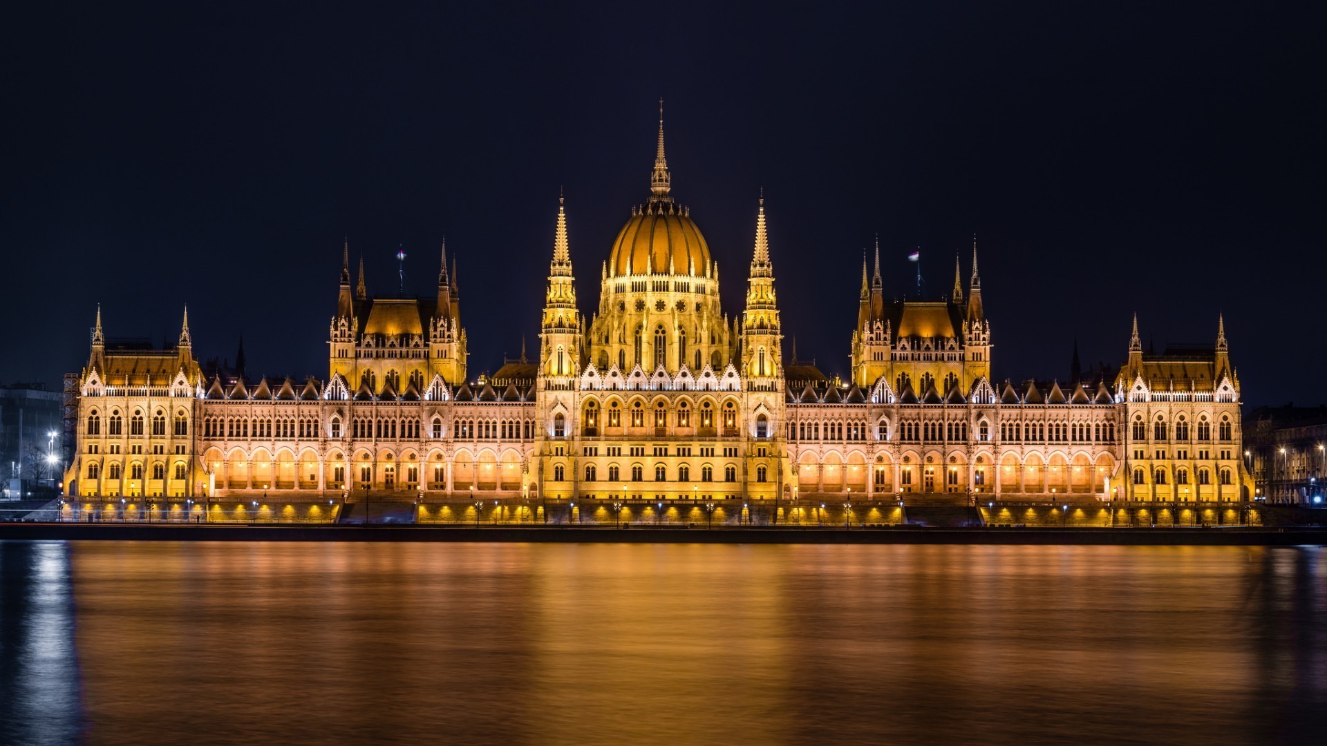 The night city is reflected in the water
