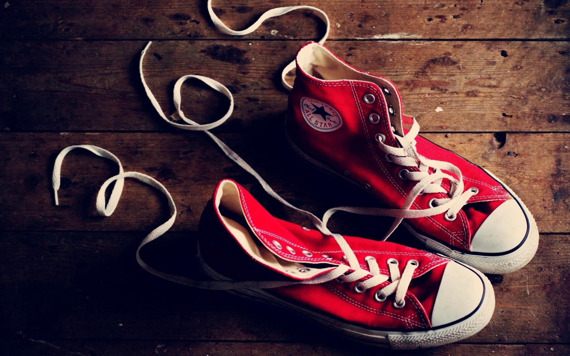 A pair of red Converse sneakers on a wooden floor with loose laces