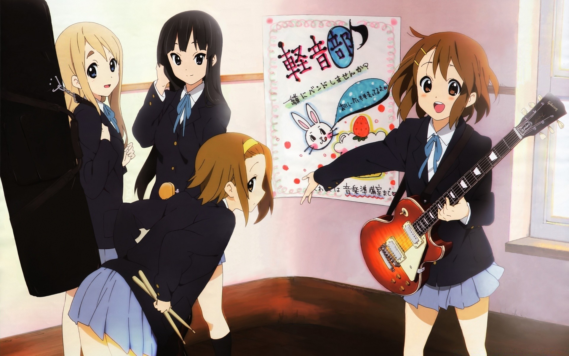 Anime four girls in short skirts with musical instruments