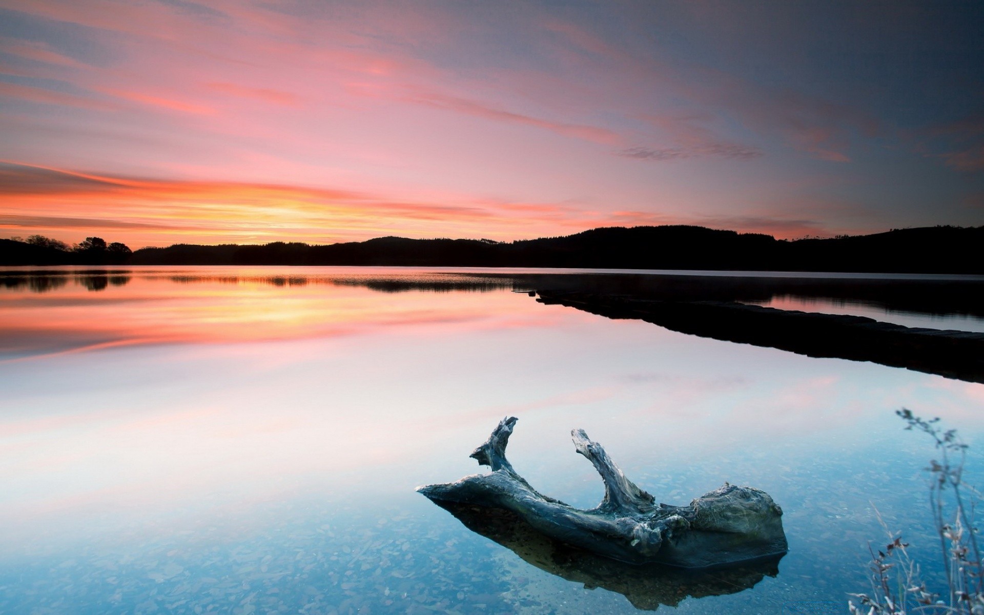 A snag in the middle of a clear lake
