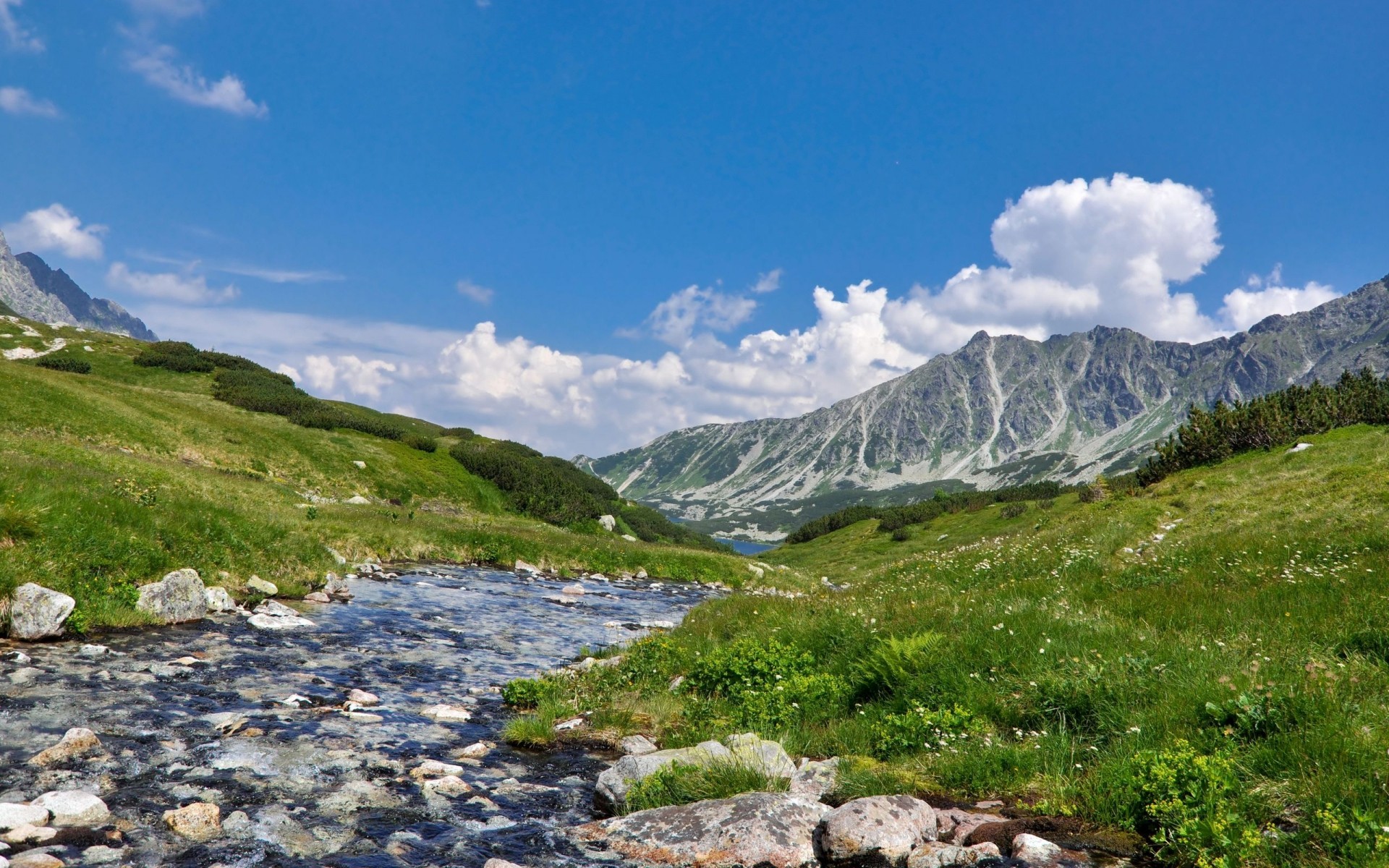 Multicolored umbrellas hang over the street between buildings against a blue sky background