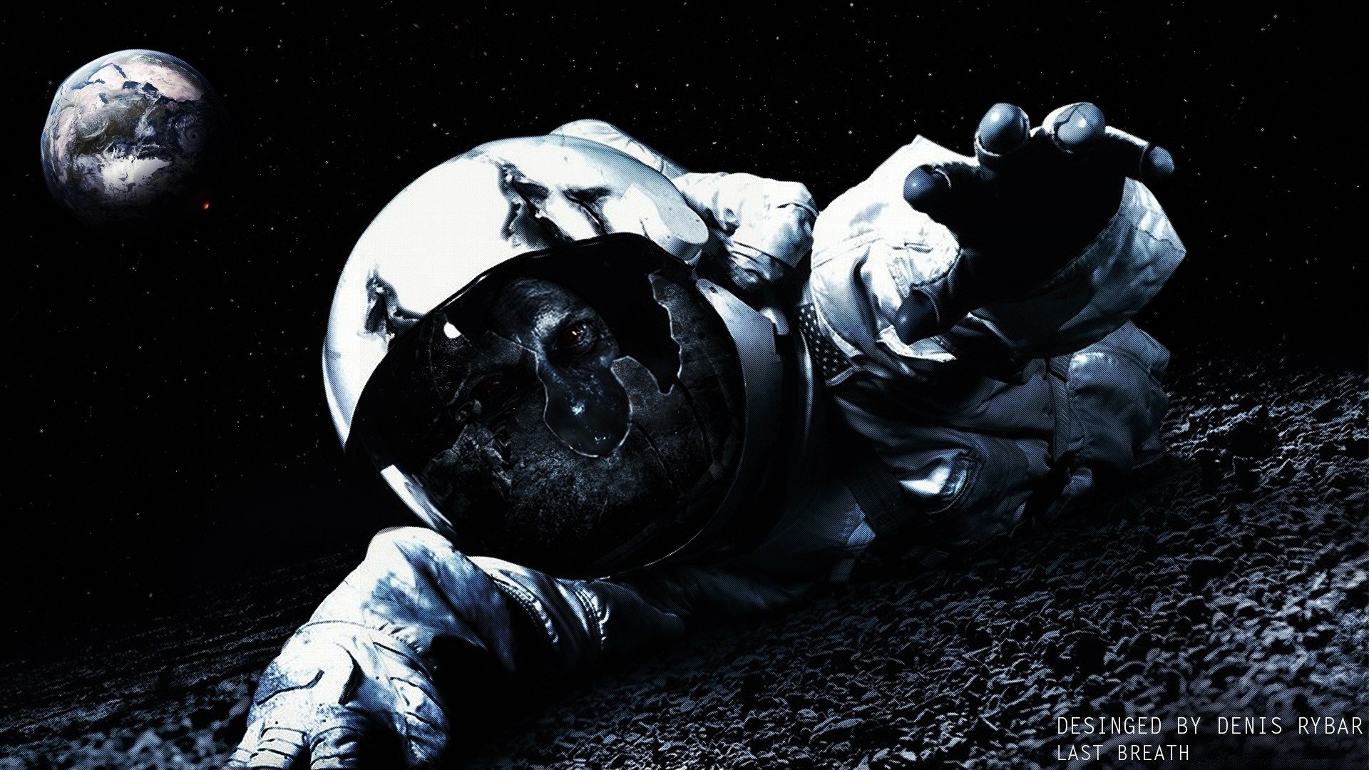 A monument in the form of the tail of a silver fish sticks out of the river against the background of the setting Moon and the night city