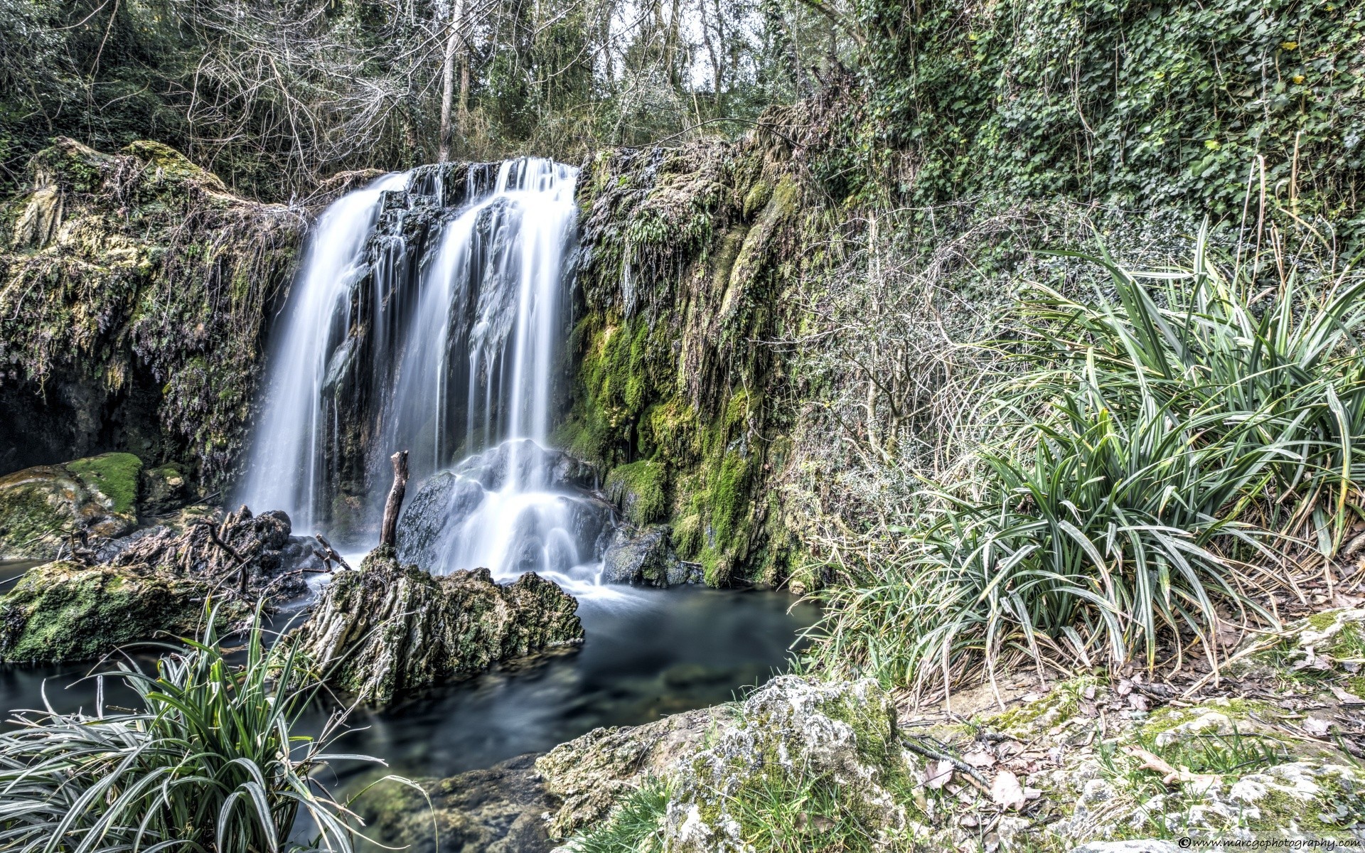 A small waterfall among rocks and yellow-green leaves of trees in the autumn forest