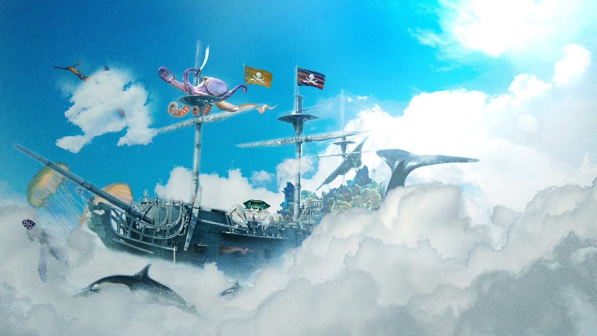 A whale ship sails through the sky