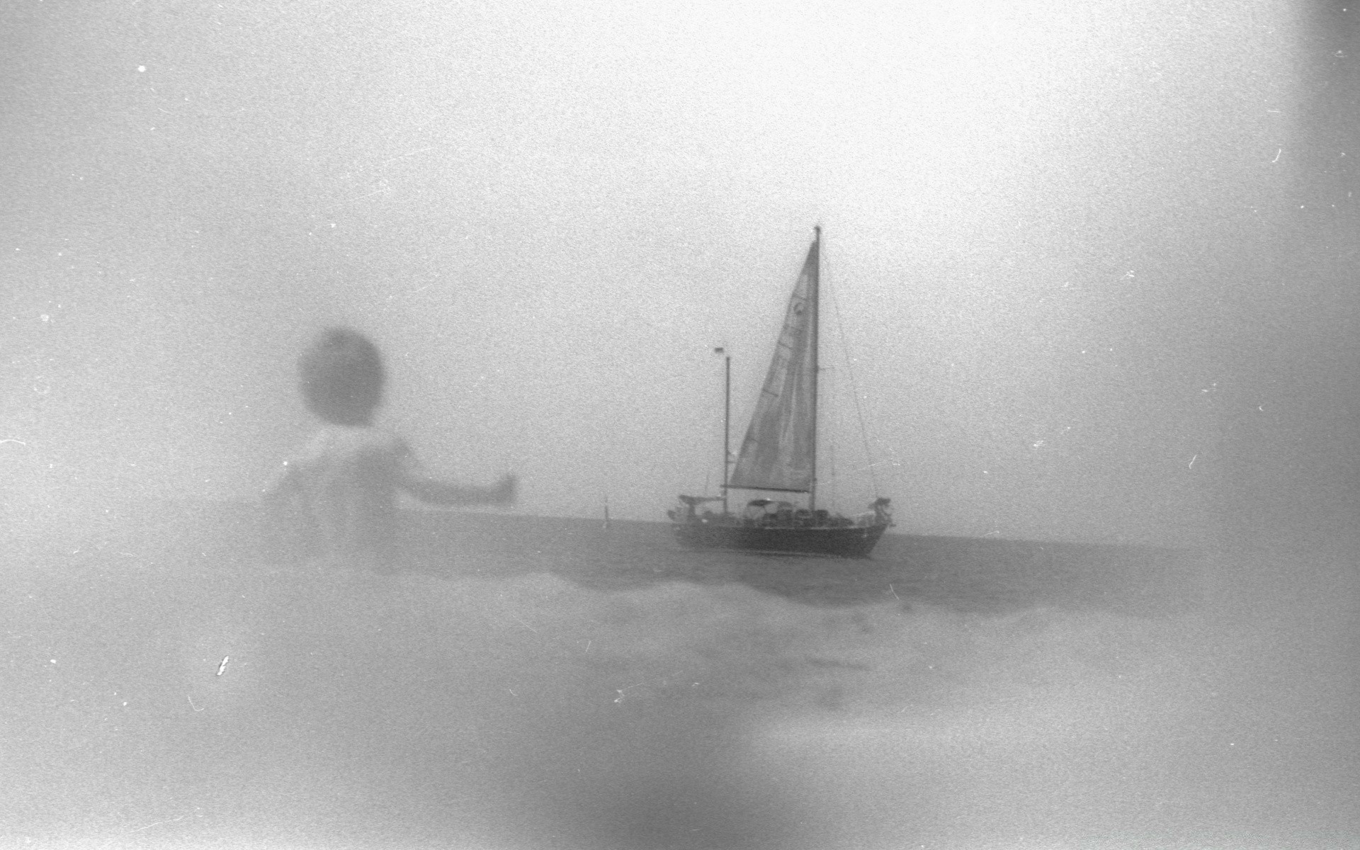 A boy meets a sailboat at sea