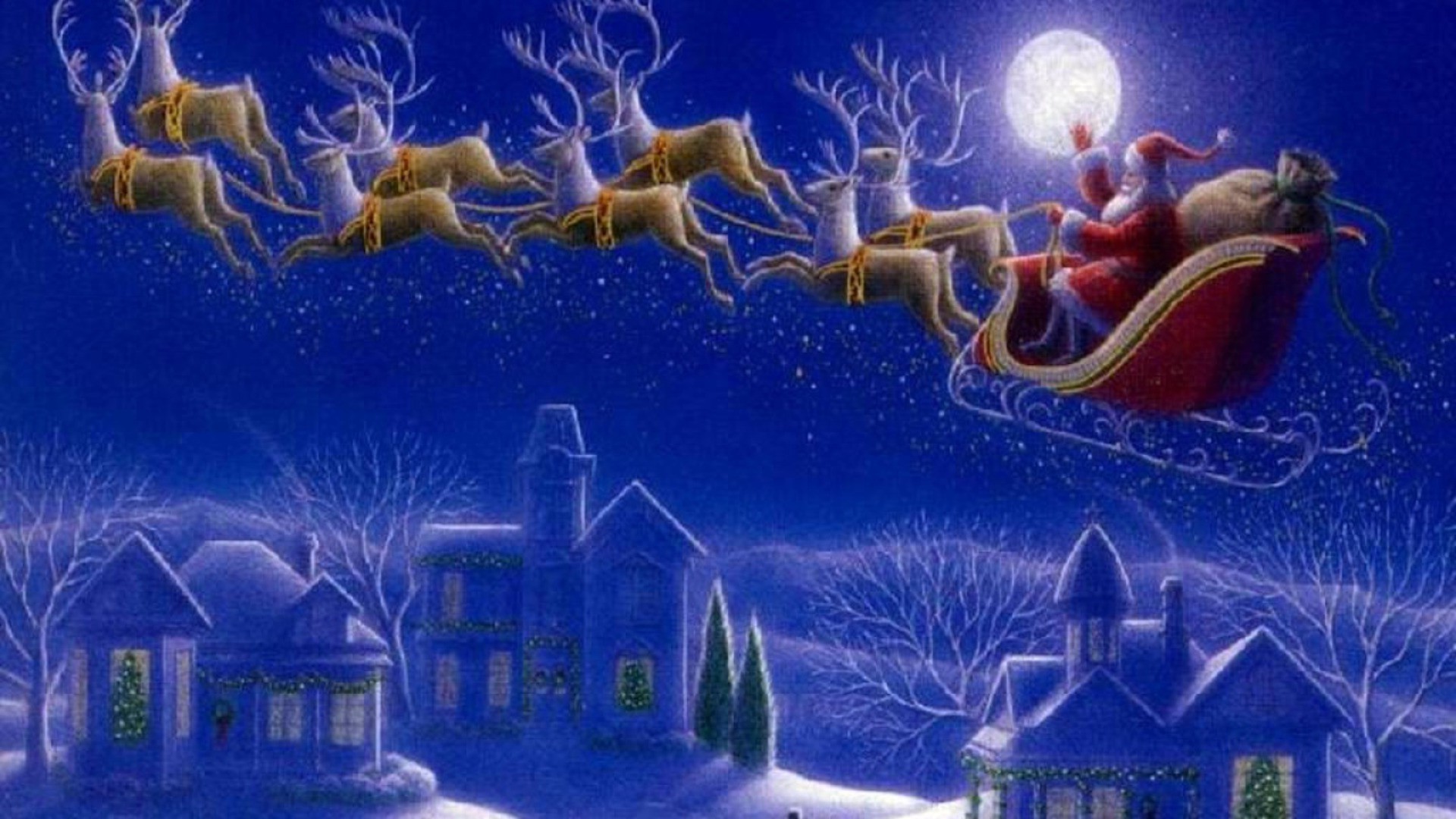 Santa Claus is flying on a sleigh with gifts