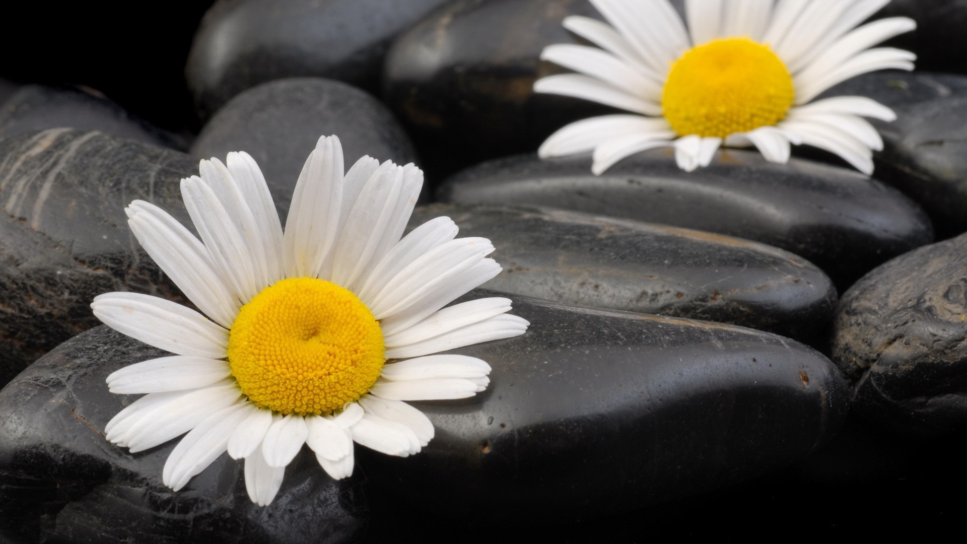 Daisies on a background of black stones