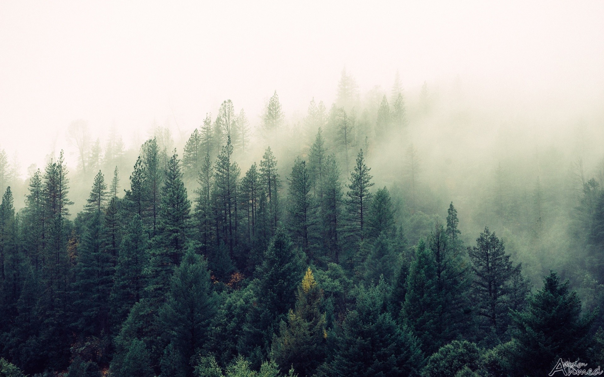 Coniferous forest in thick fog
