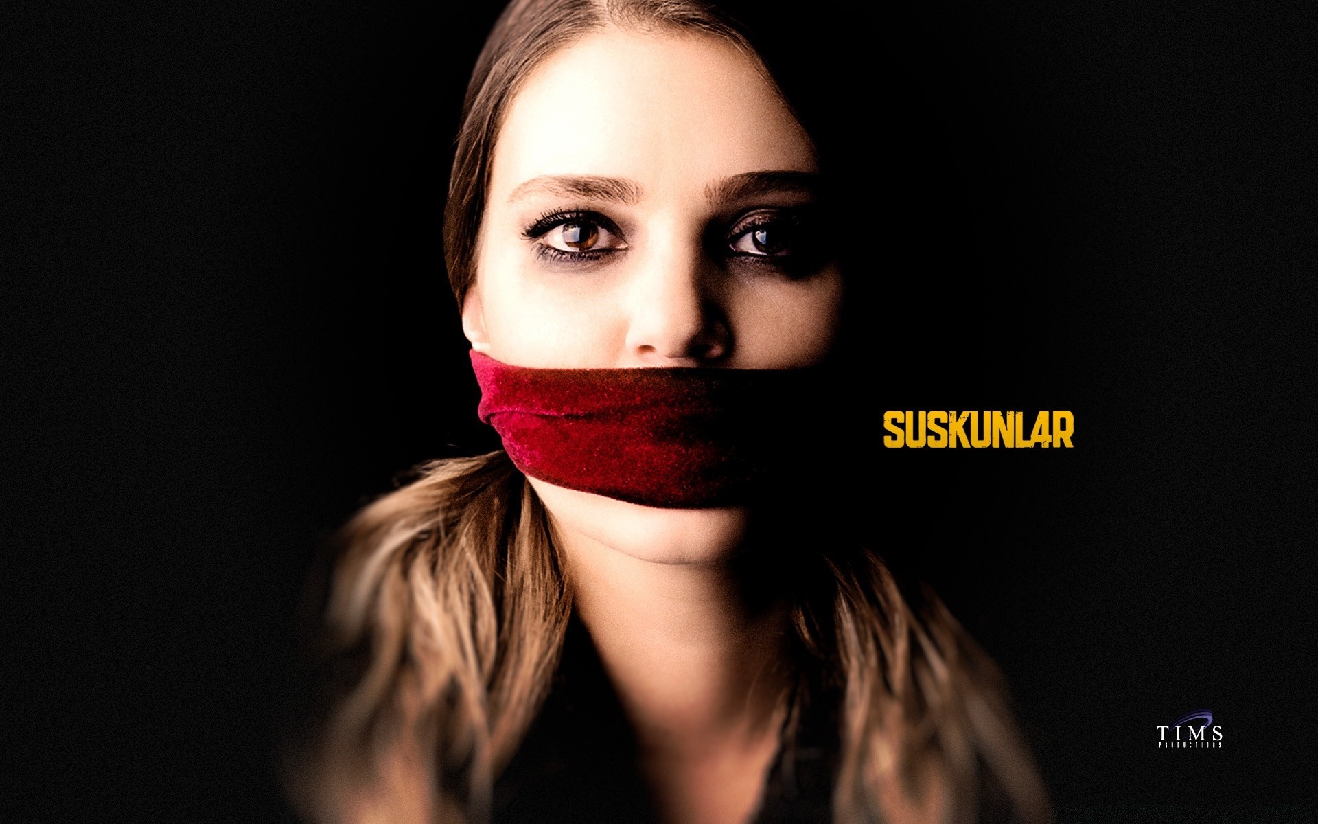 A woman with a blindfold over her mouth on a dark backgroundA woman with a blindfold over her mouth on a dark background