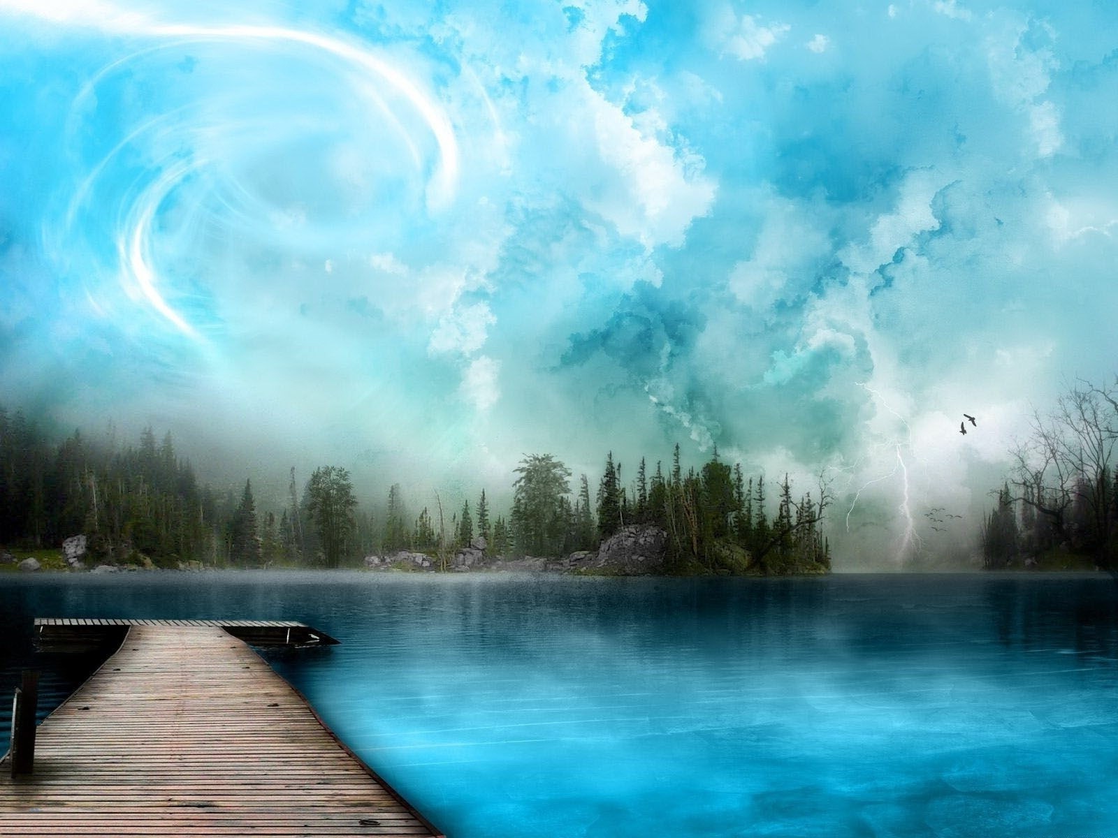 Landscape of a field with a road going into the sky-high horizon, a huge planet in the sky