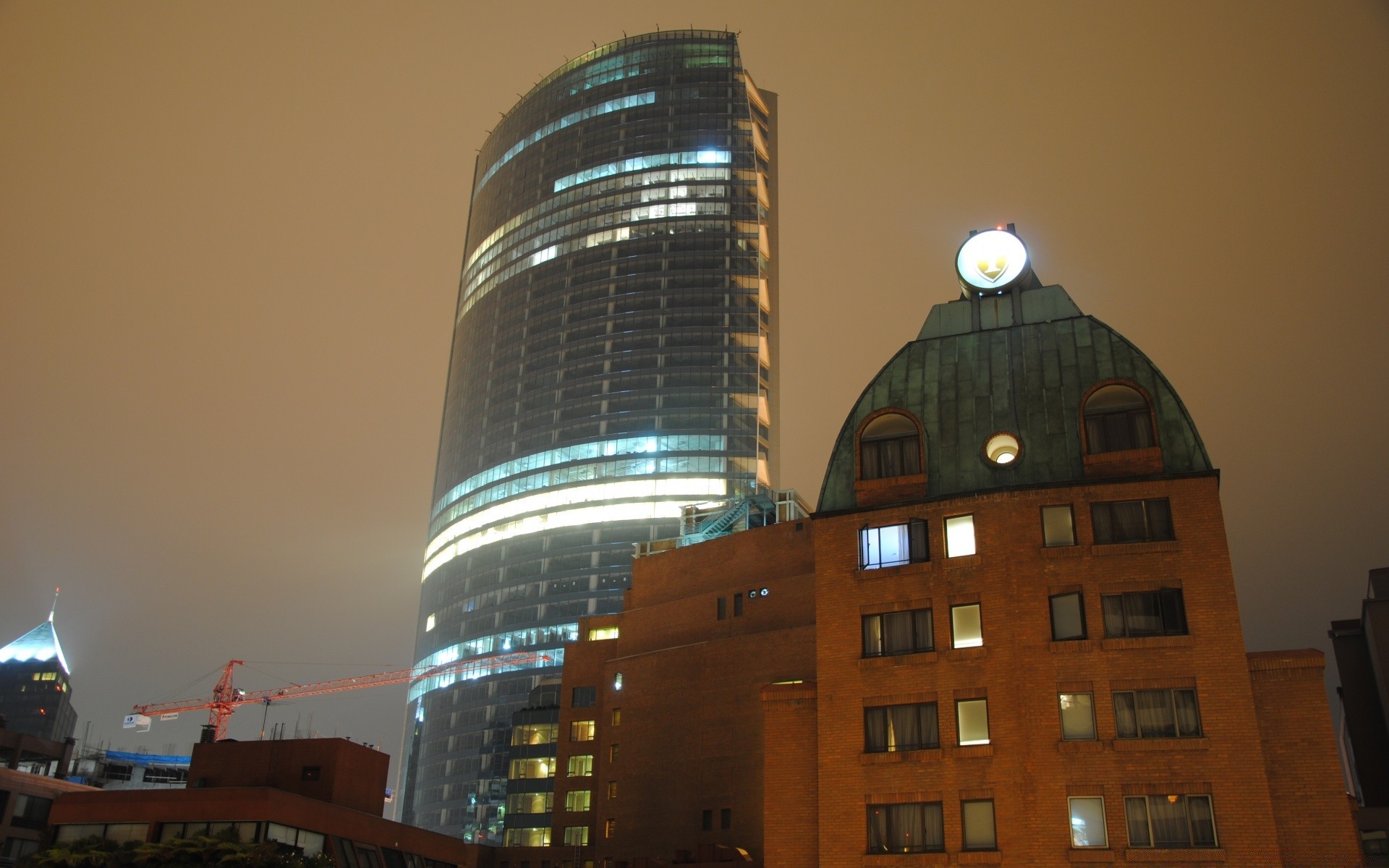 One skyscraper with smooth lines and a building with a non-standard roof