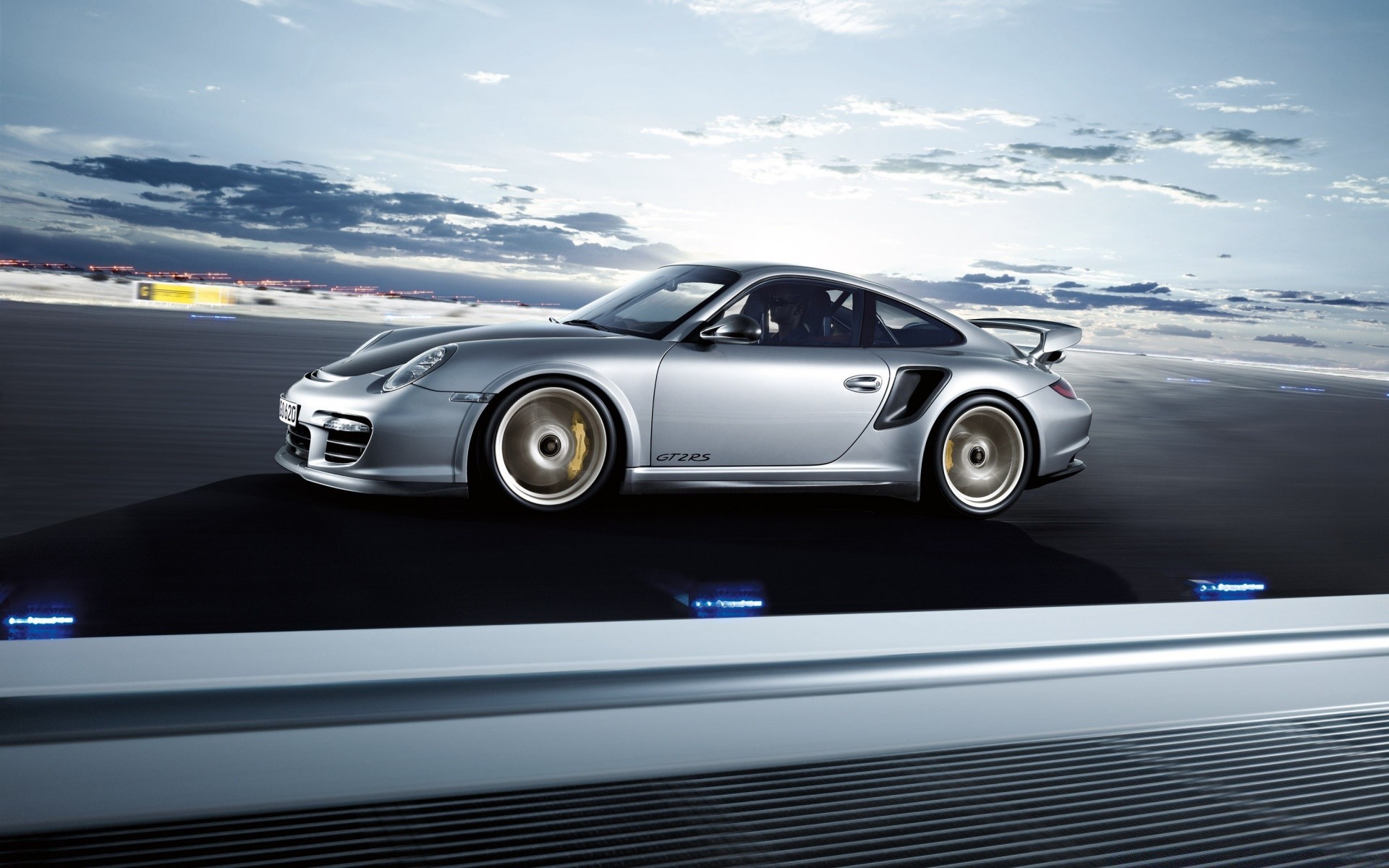A silver car rushing like an arrow