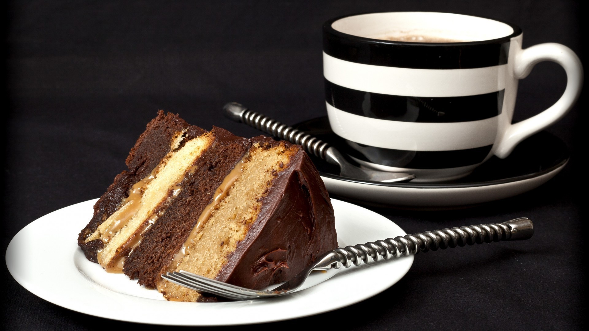 A cup with a cake on a black table