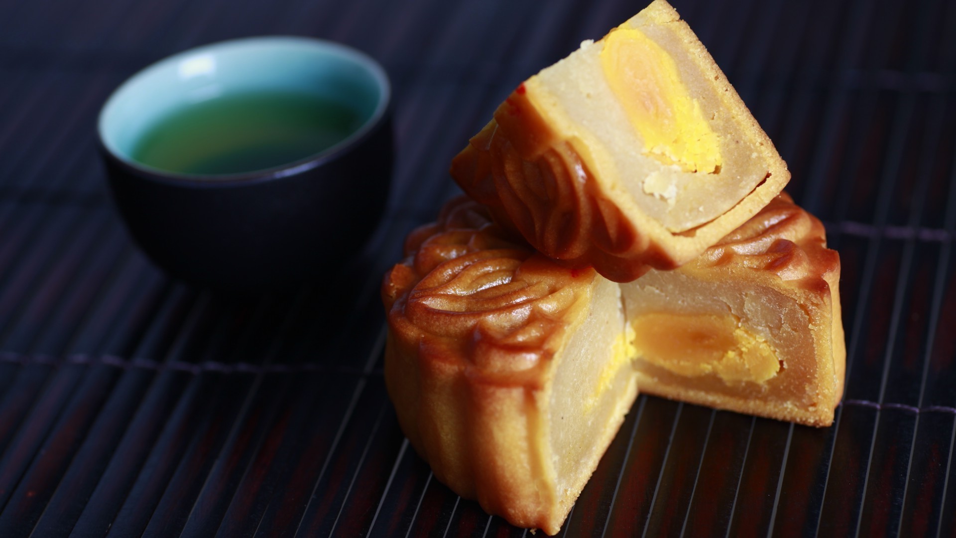 A modest breakfast - green tea and a bun with stuffingA modest breakfast - green tea and a bun with stuffing