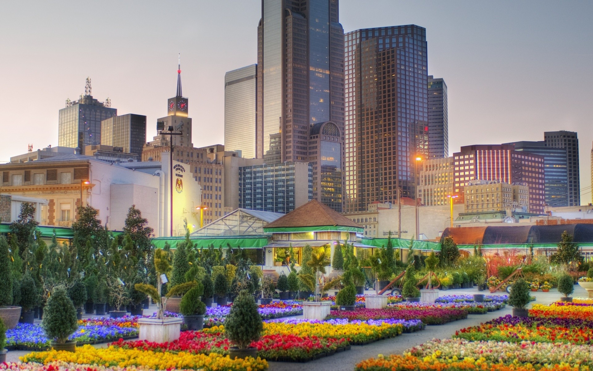 Multicolored flowers on the background of skyscrapers