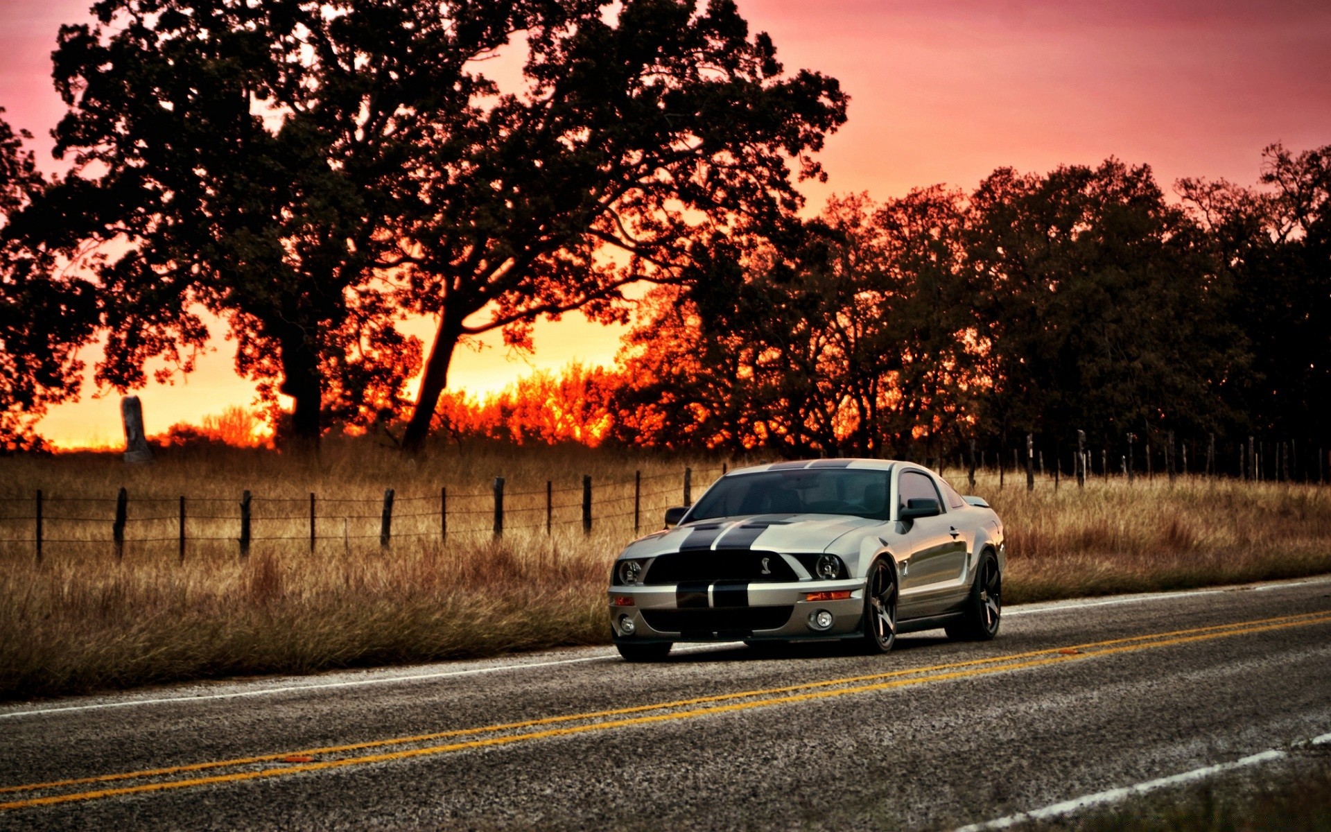 A beautiful brass Ferrari sports car is driving fast on the evening road