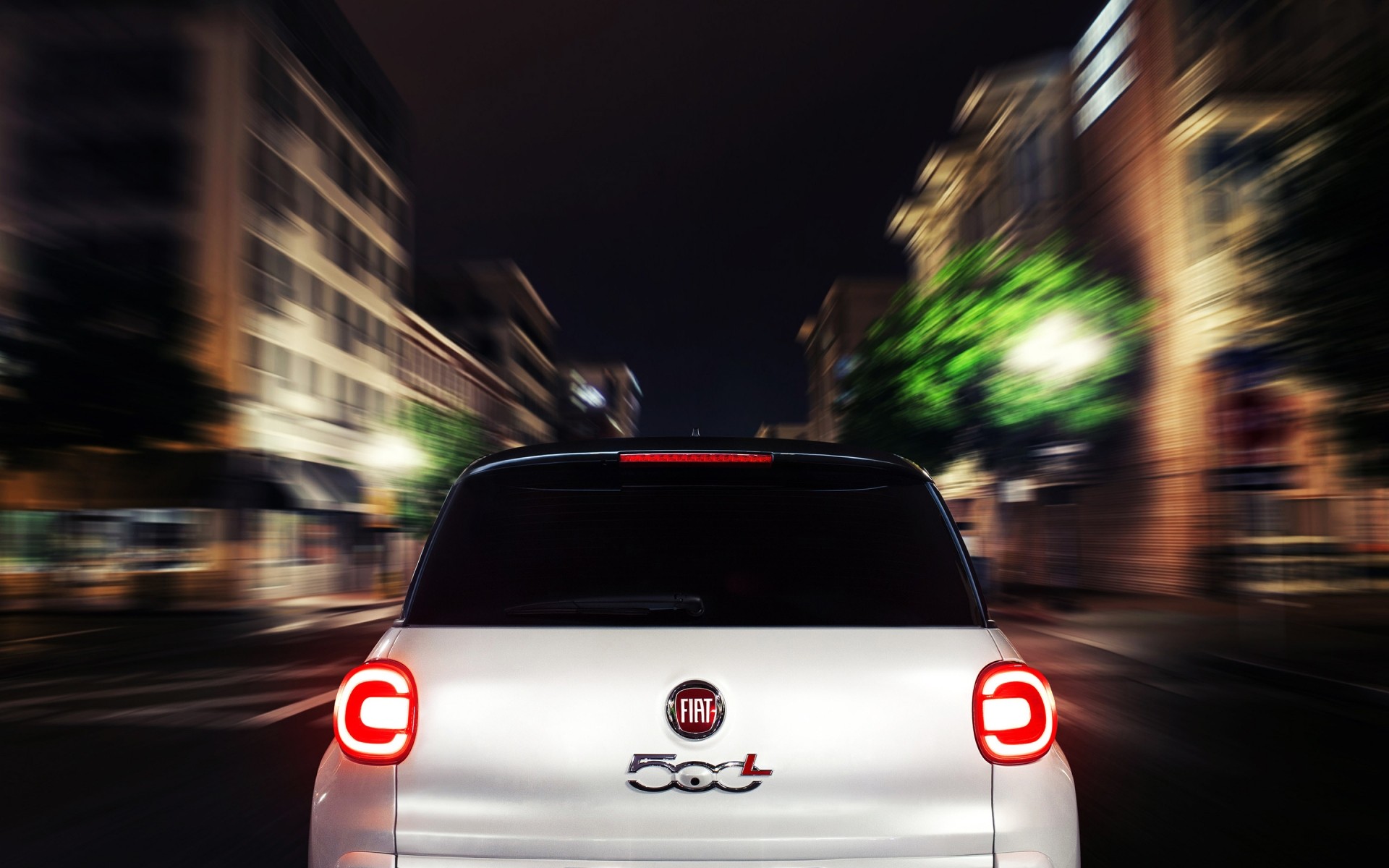 A white Fiat driving fast through the city