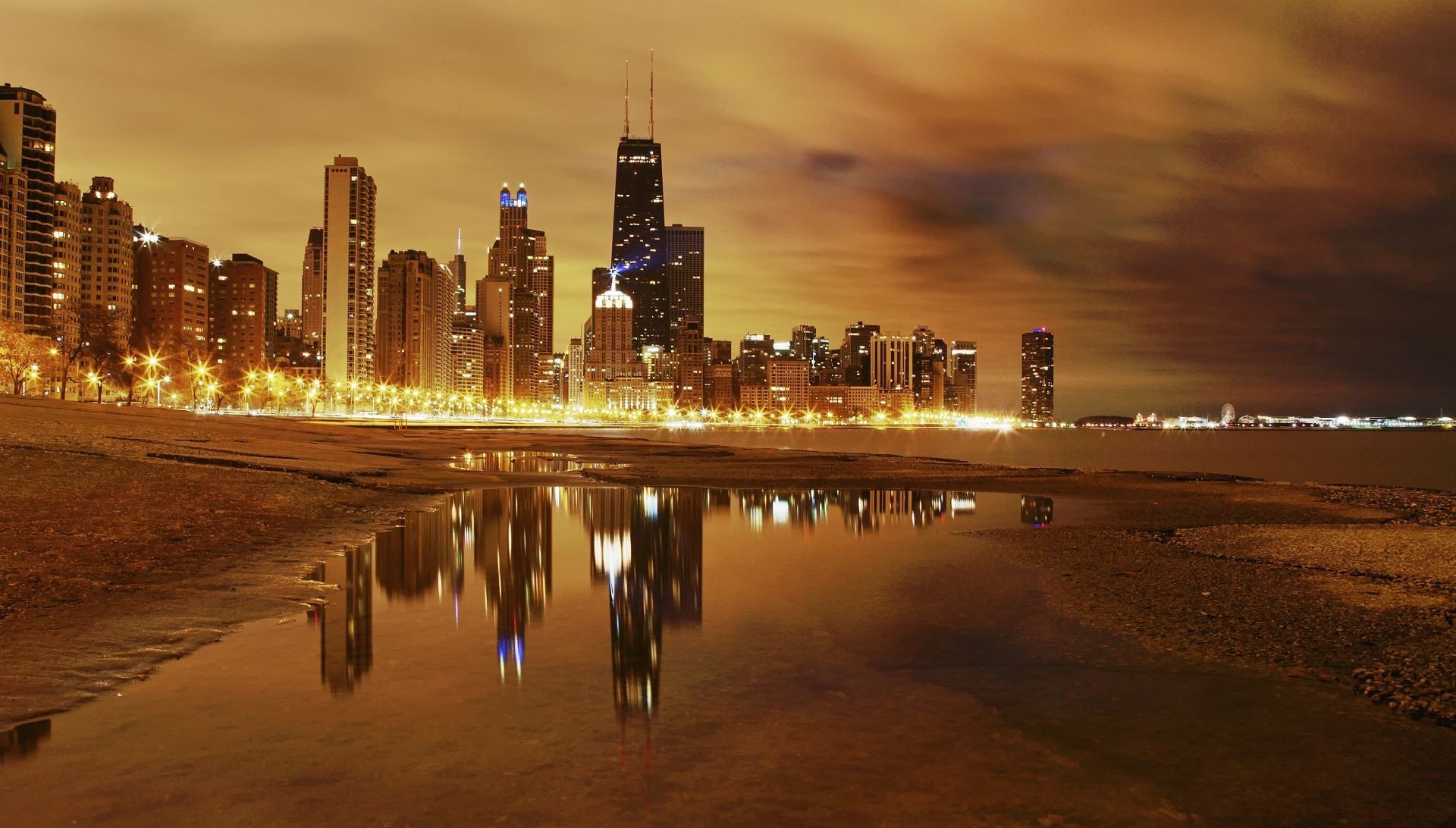 The metropolis is reflected in the water at sunset