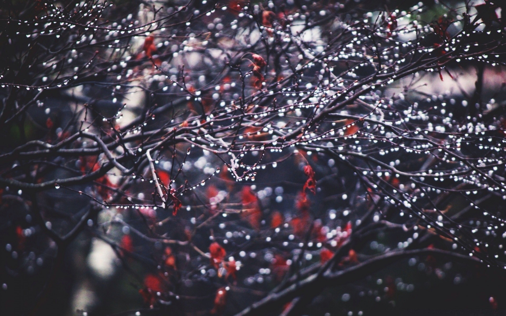 A wet twig with large drops on a background of red berriesA wet twig with large drops on a background of red berries