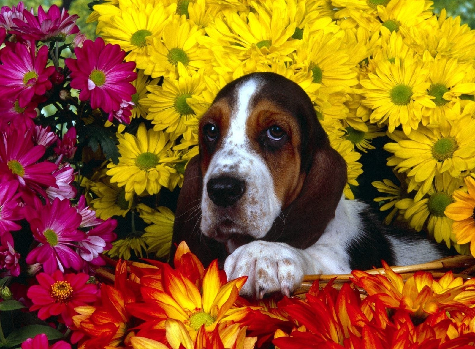 Cute dog in flowers. Animals and nature