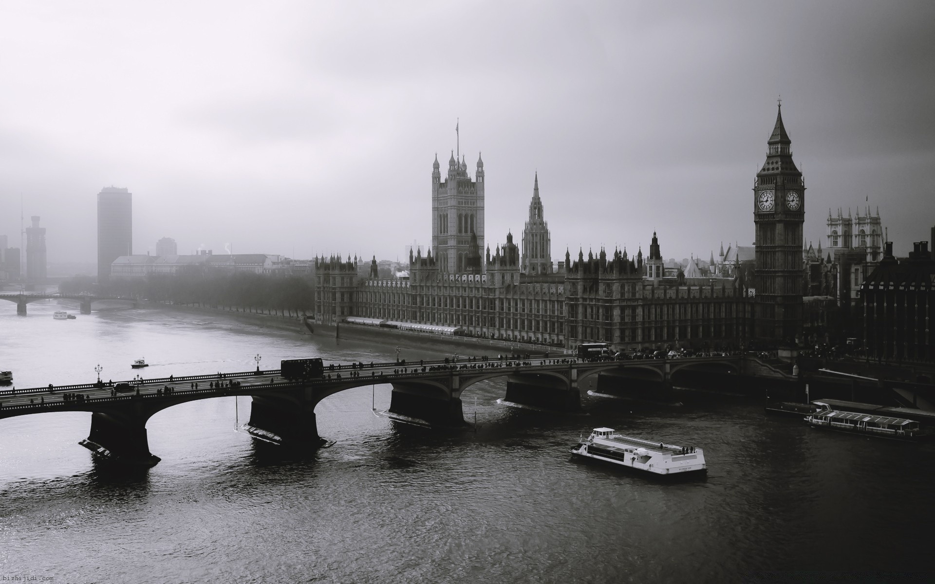 A gray city and a huge bridge across the river