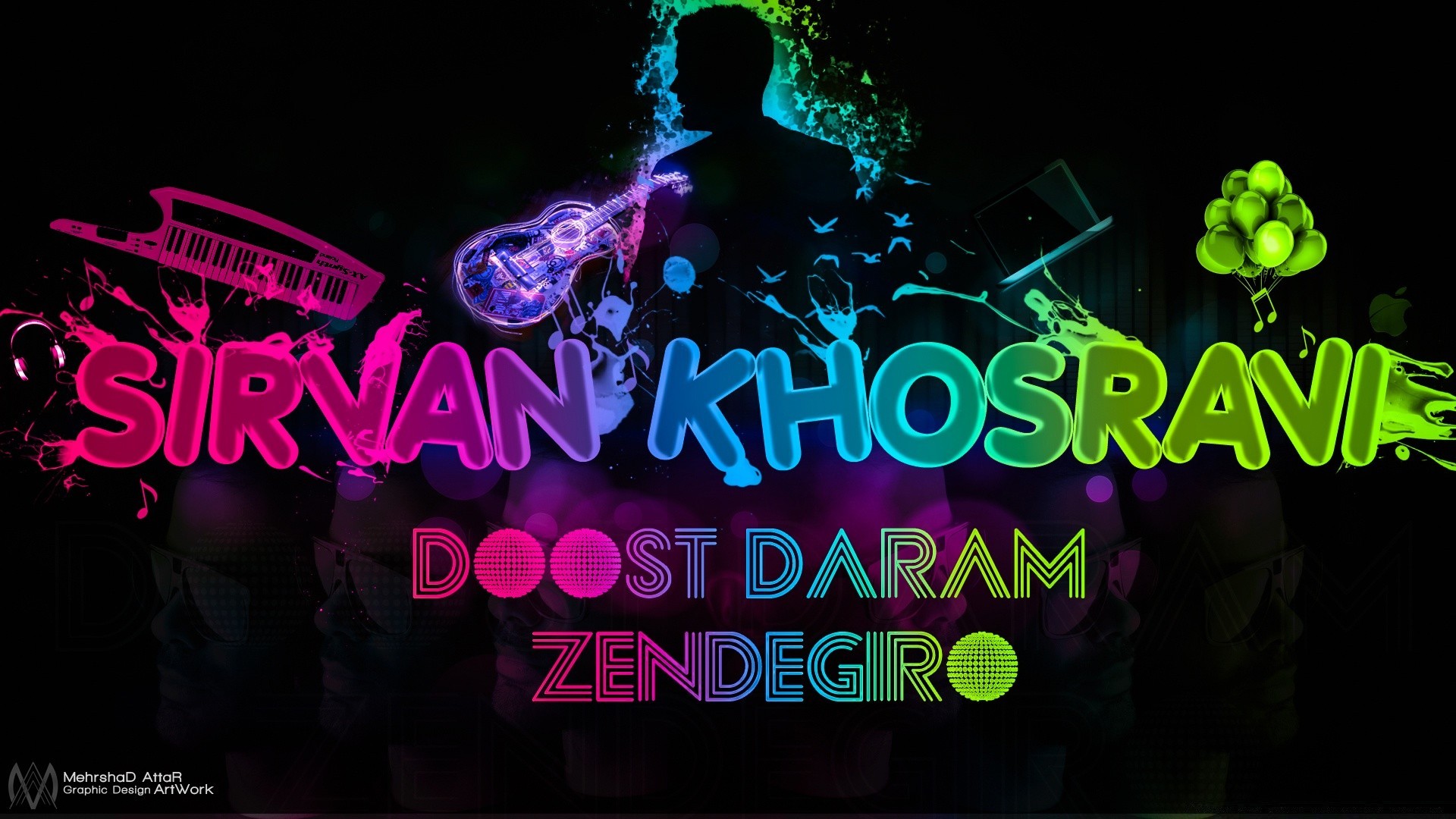 Illustration with bright text and musical instruments