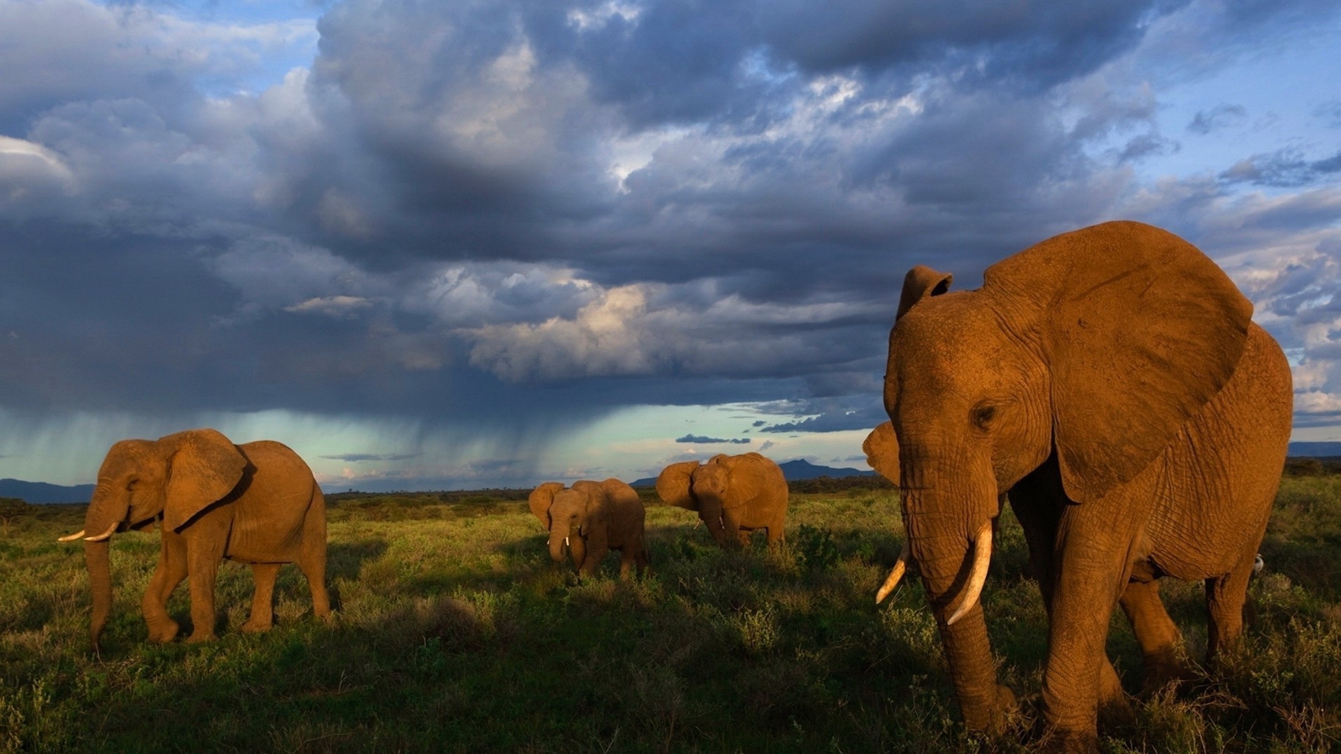 A herd of elephants goes to a flophouse under the light of the setting sun