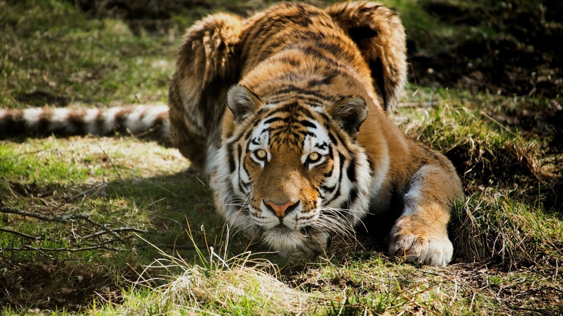 An adult tiger is preparing to jump