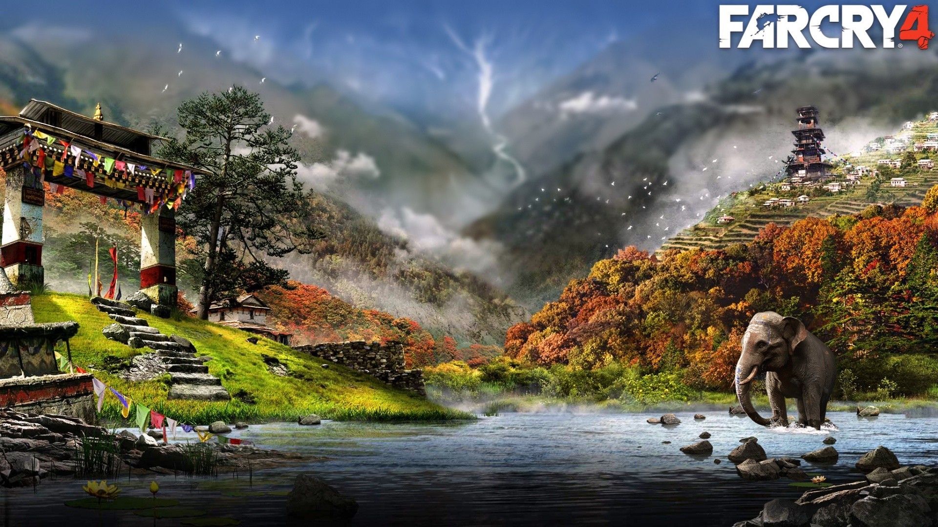 Asian-style landscape with a pagoda and an elephant from the game Farcry 4