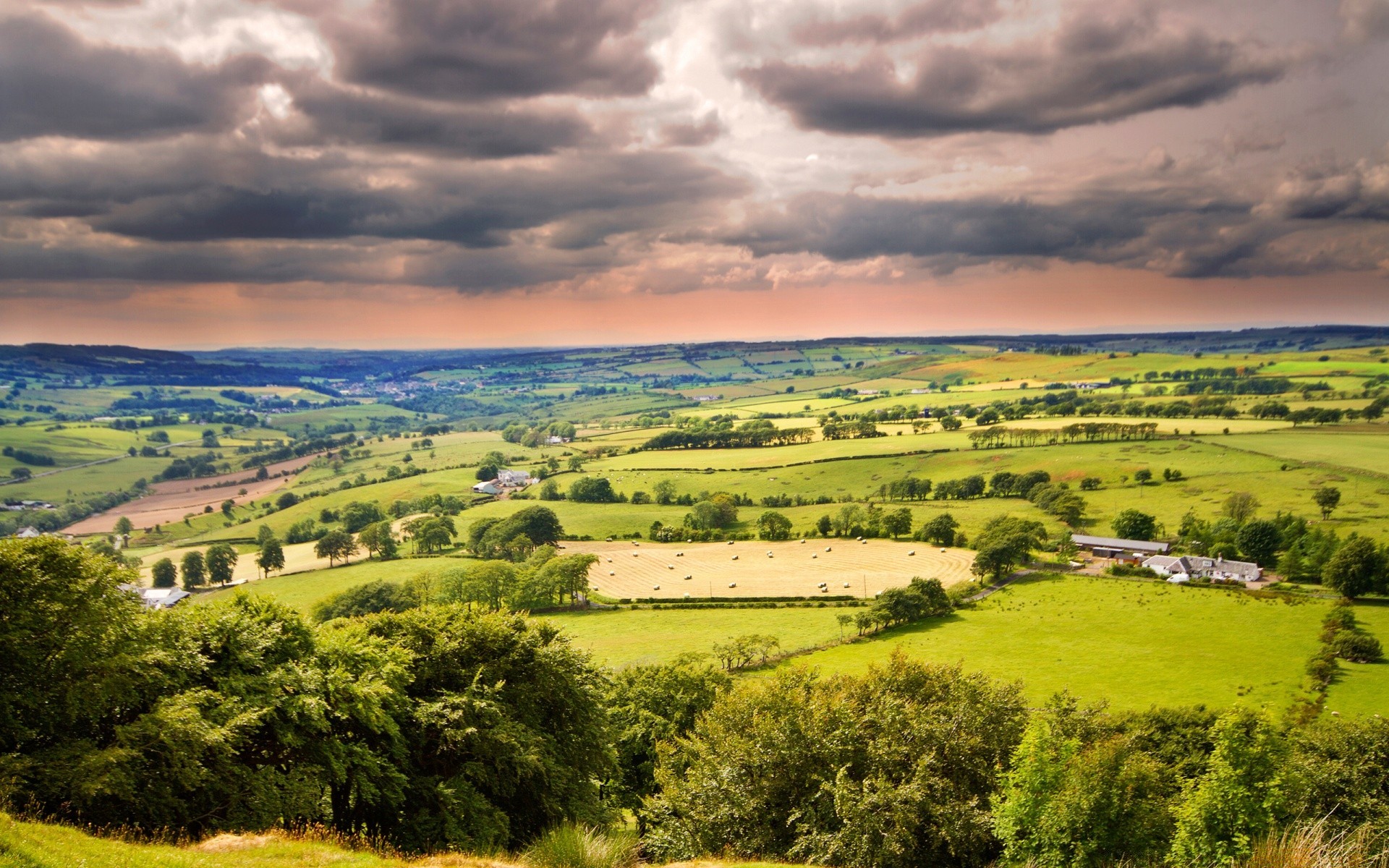A beautiful field with a tree. The sky before a thunderstorm