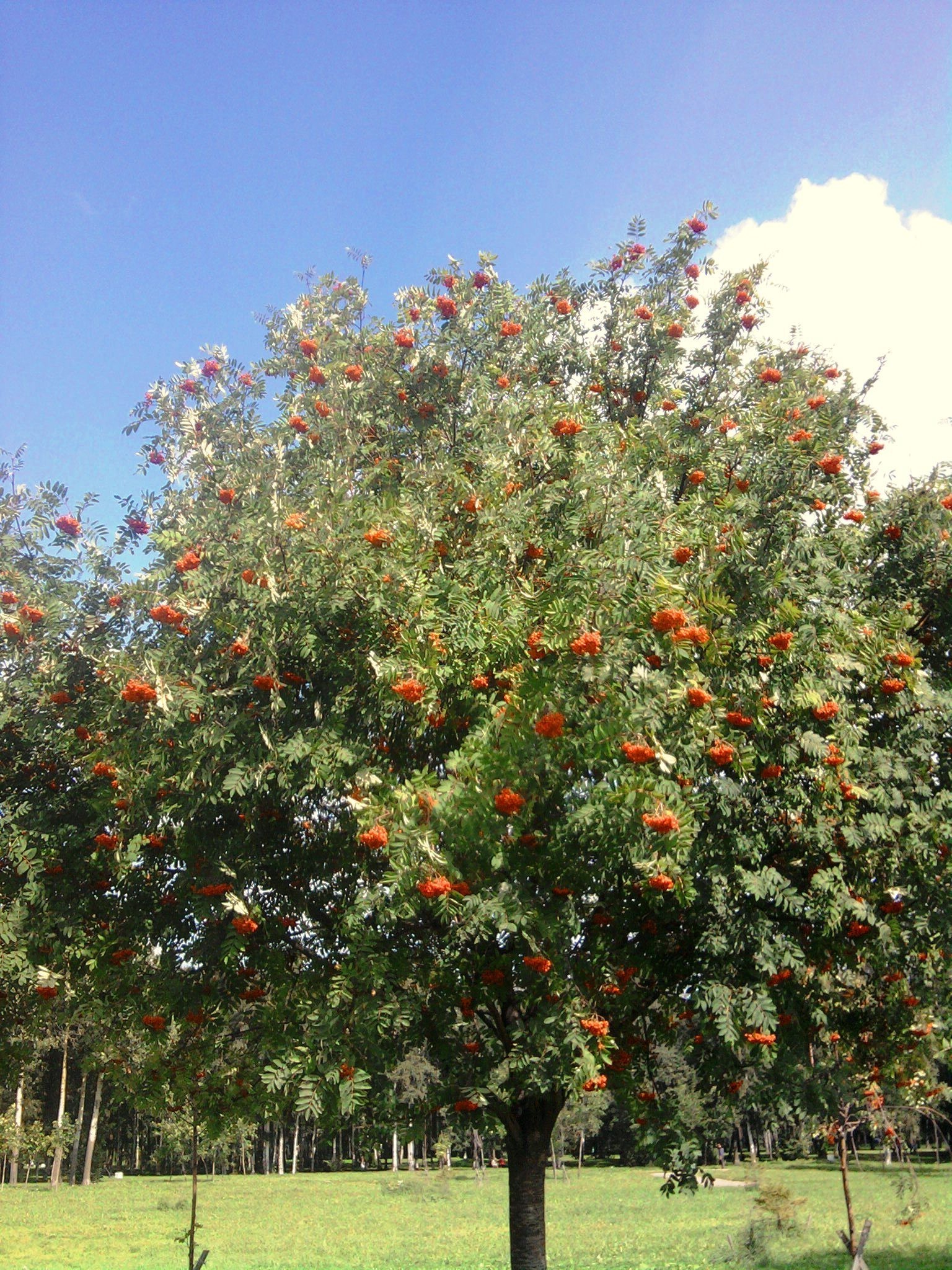 A rowan tree, strewn with berries, stands in a clearingA rowan tree, strewn with berries, stands in a clearing