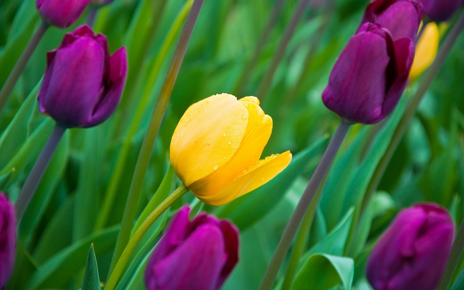 Multicolored tulips on a background of juicy greenery