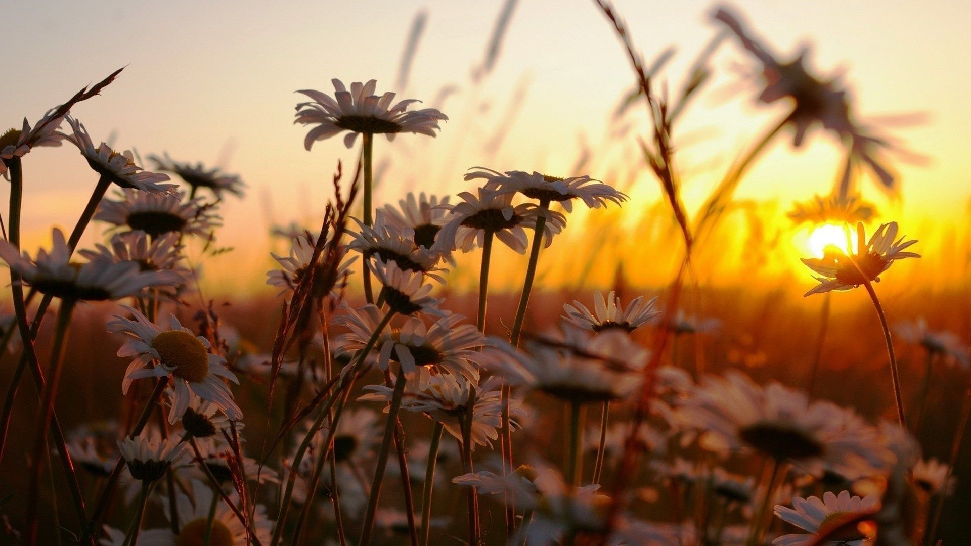 Chamomile field in the sunset
