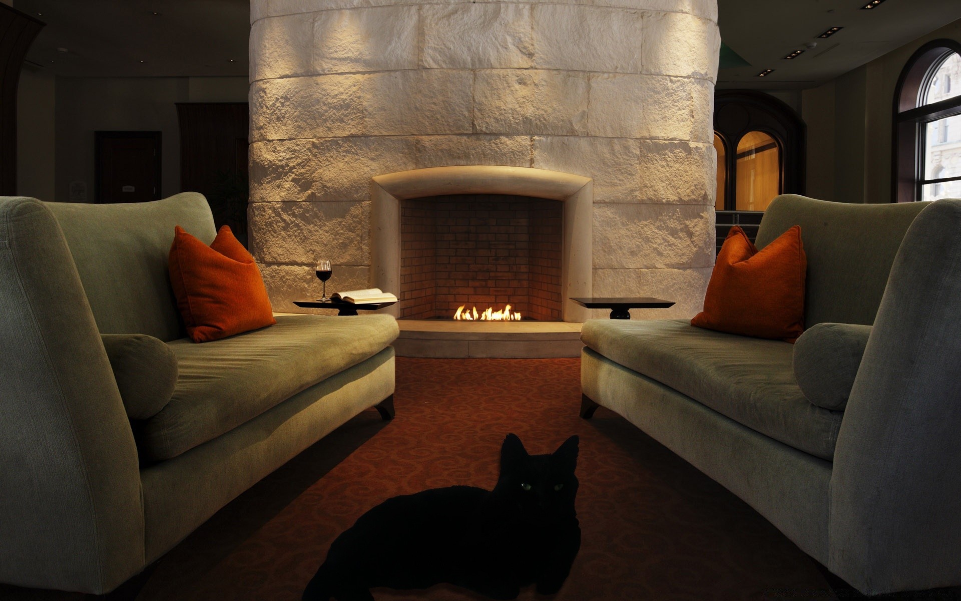 Green sofas and a black cat by the fireplace