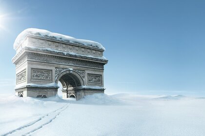 An antique stone arch wrapped in a fluffy blanket of snow