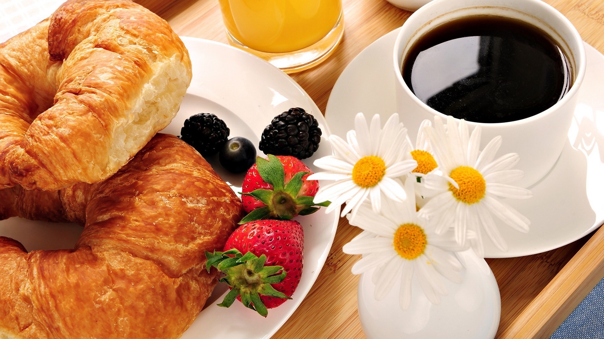 Coffee, daisies, booths and berries on a tray