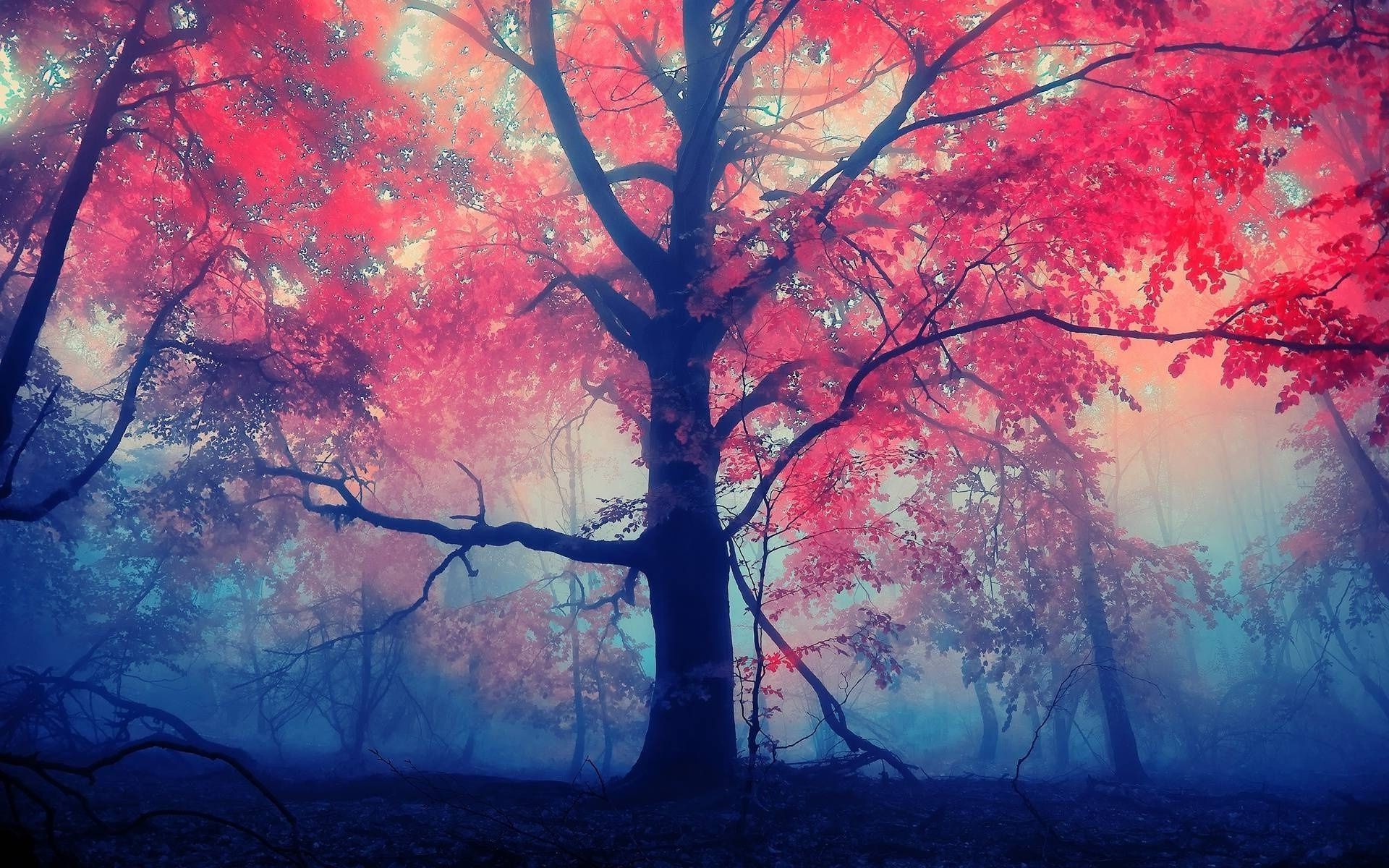 Elegant Christmas tree in the middle of the forest. A lot of gifts under the Christmas tree