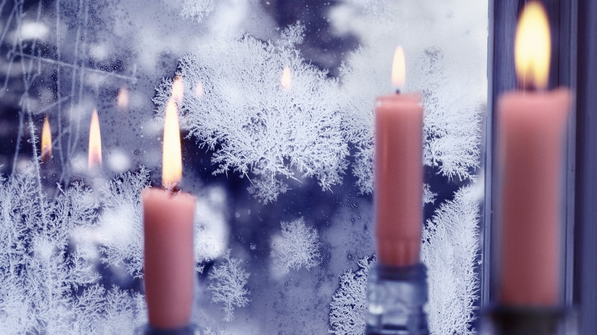 Lit pink candles on a background of frozen glass