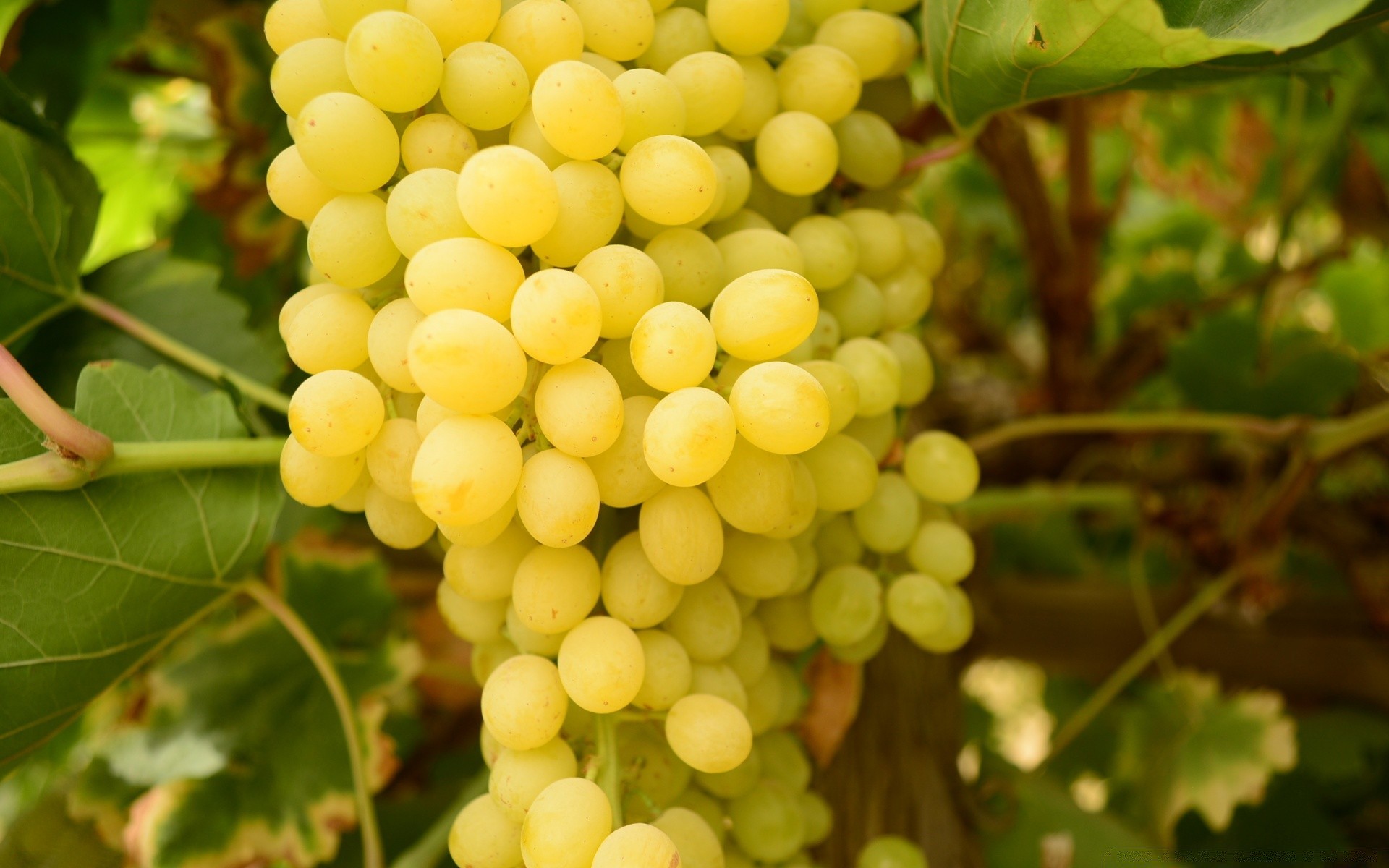 A huge bunch of yellow grapes with green foliage. sunny grapes