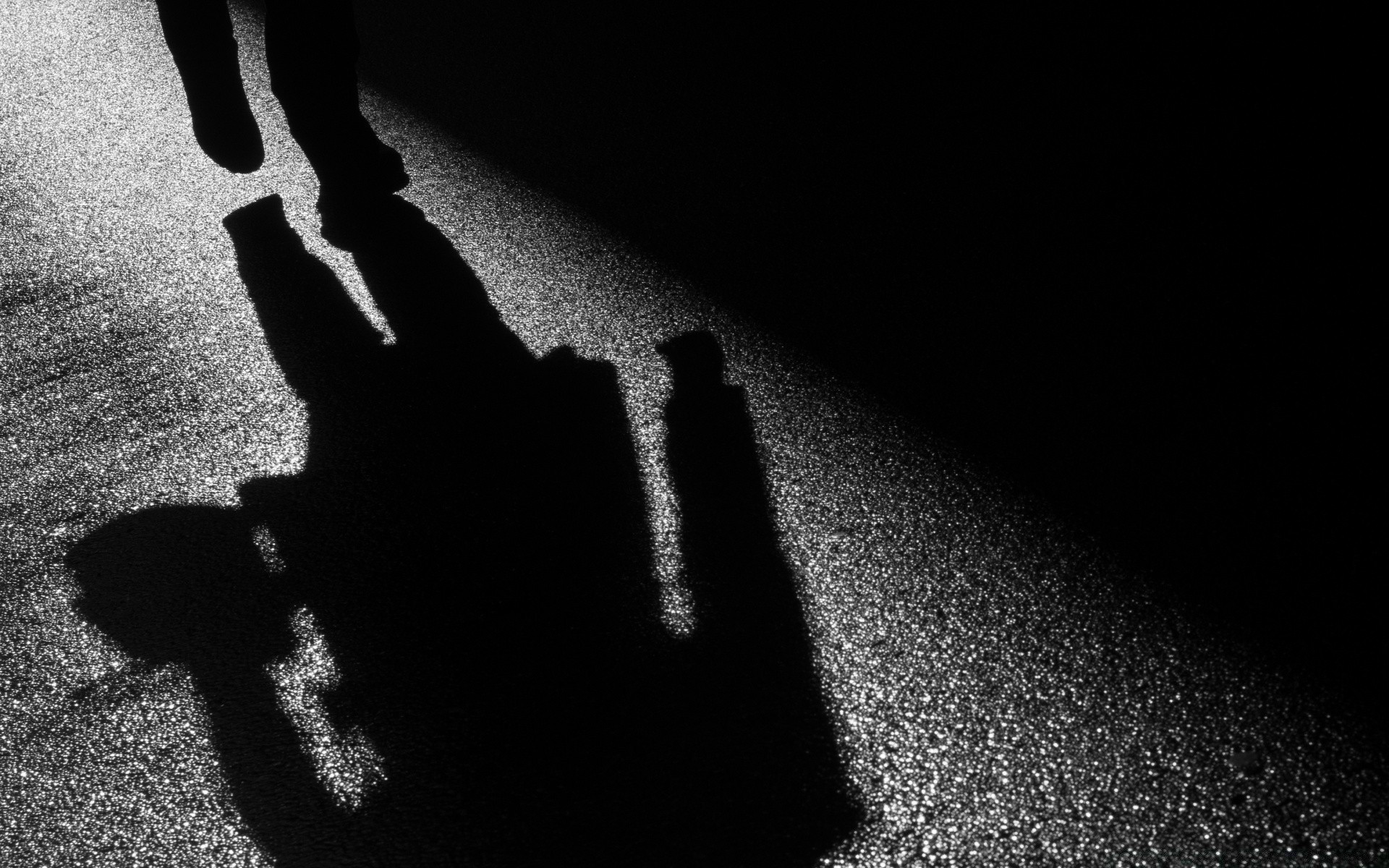 A man on a blurred background in the rays of the sun with a shadow of blinds