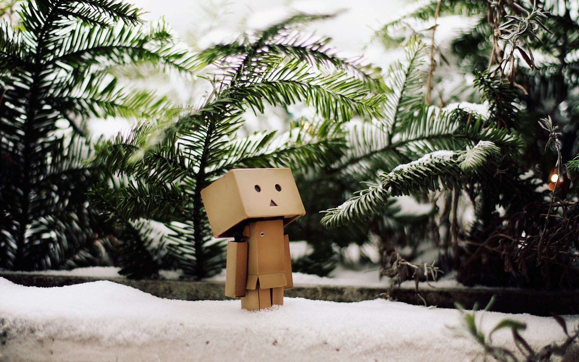 A robot made of cardboard boxes stands in the snow among the fir branchesA robot made of cardboard boxes stands in the snow among the fir branches