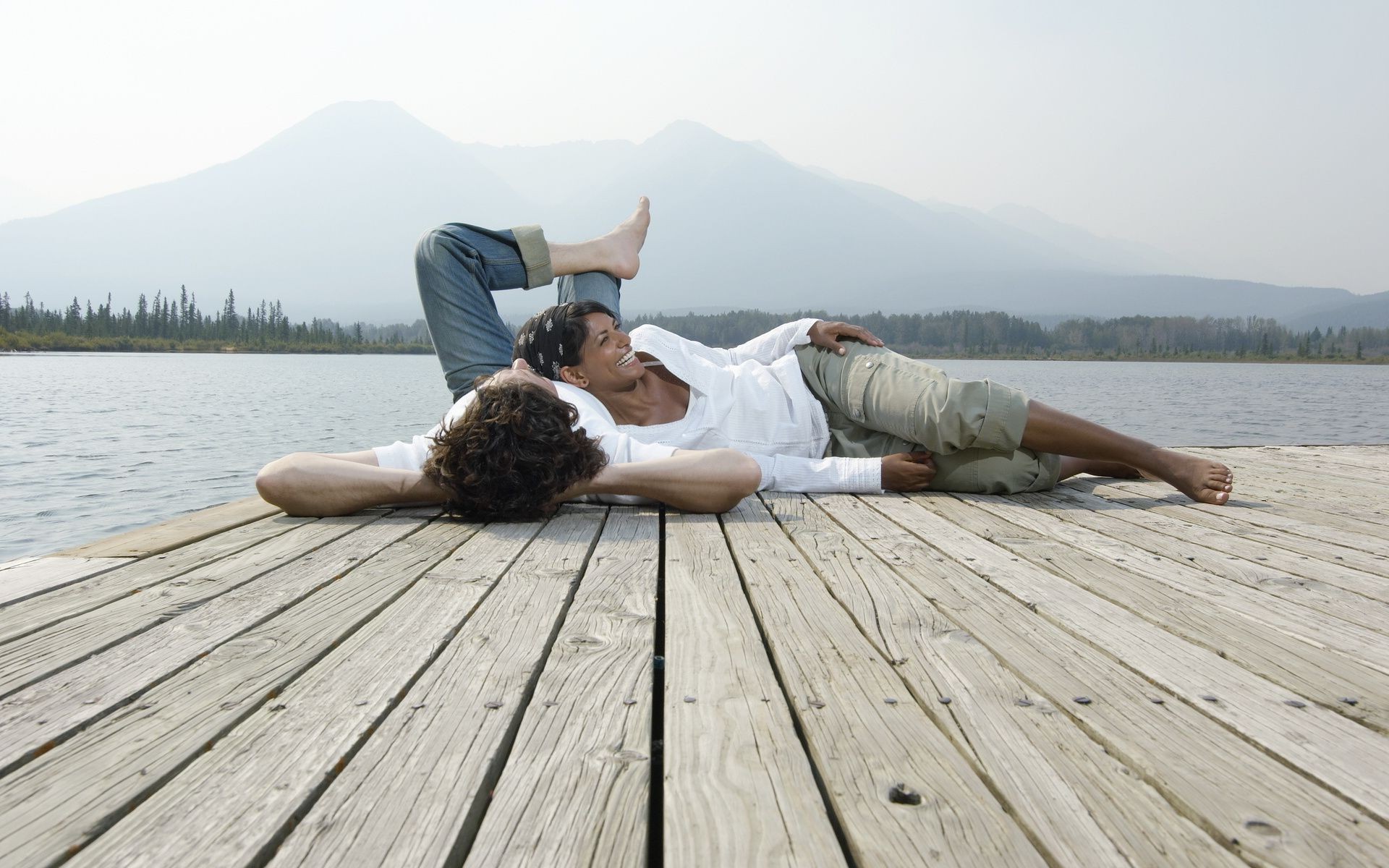 Palm trees on the beach at dusk overlooking the mountain peak and the bay