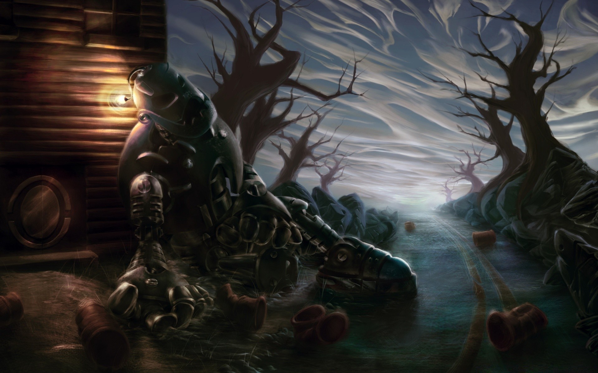 A man in stampunk armor is sitting by the water