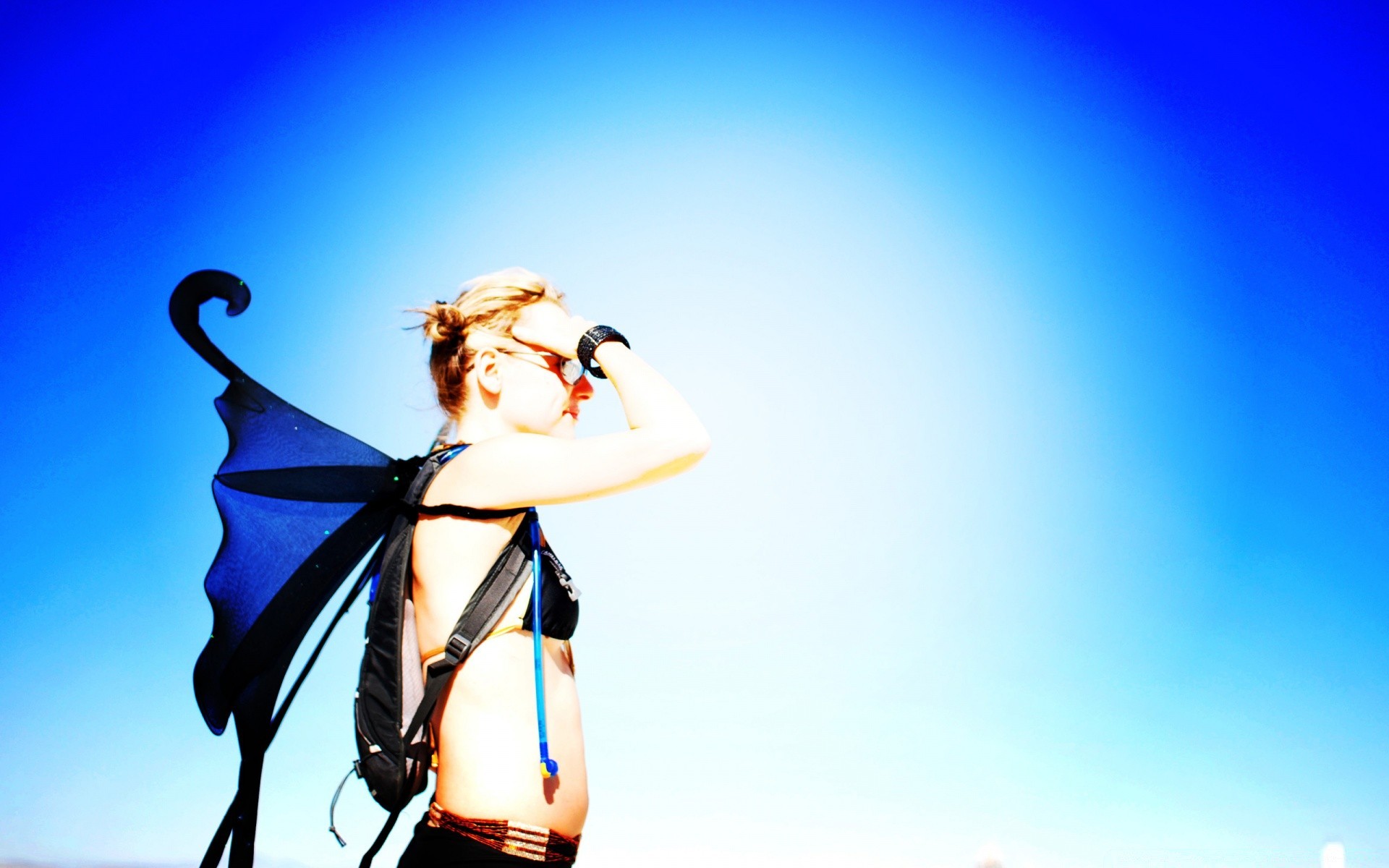 The girl in summer is not against the blue sky
