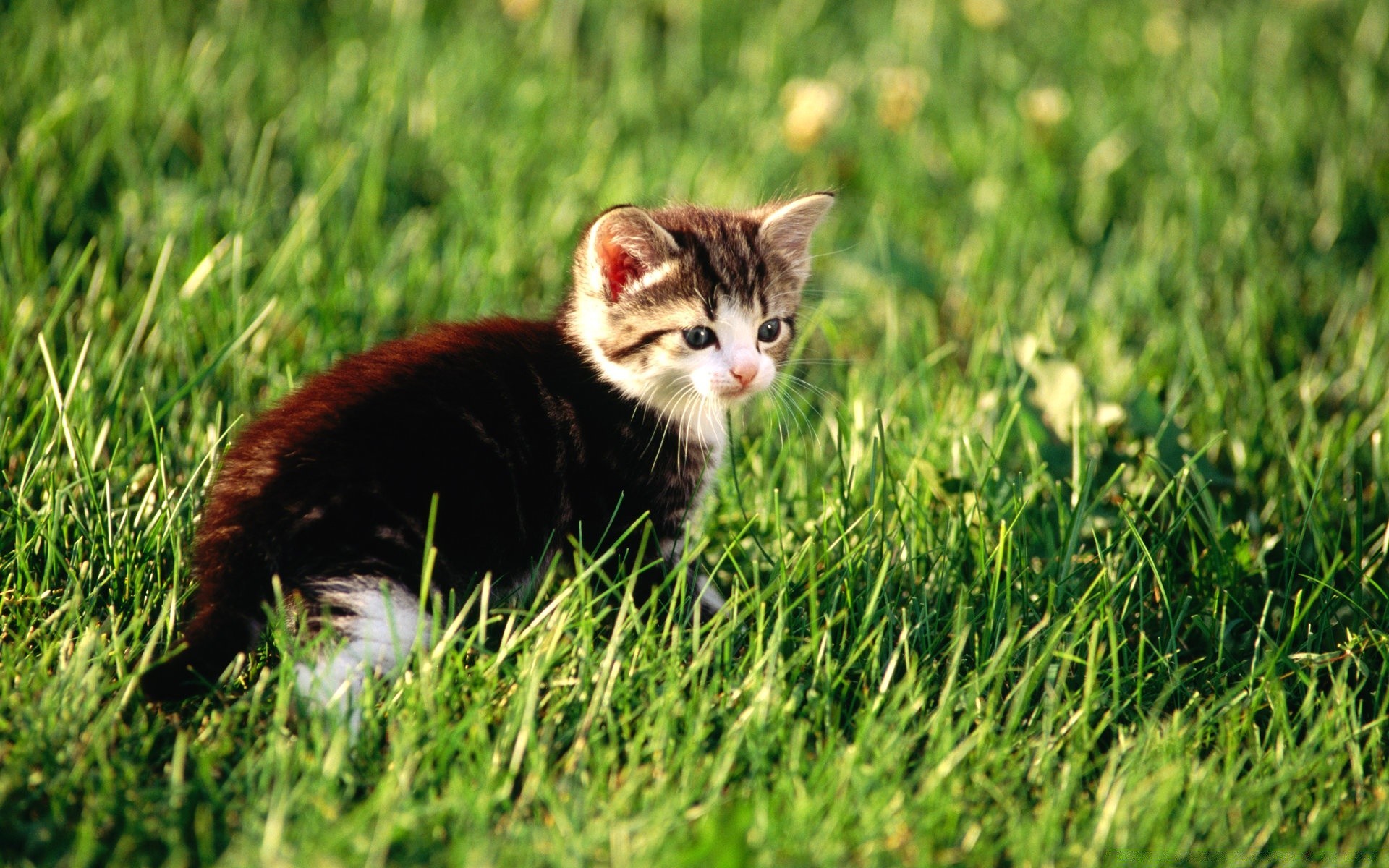 A little kitten walks in the grass