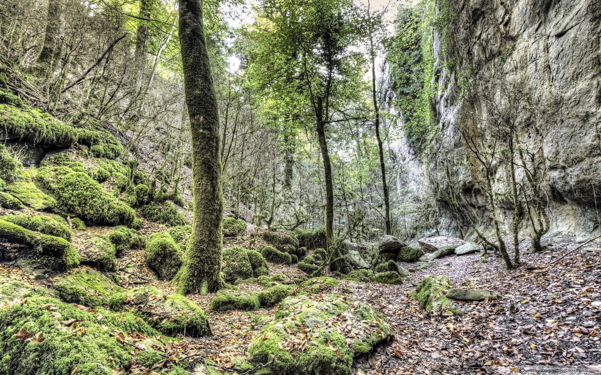 Moss-covered trees in a gloomy forest illuminated by the sun
