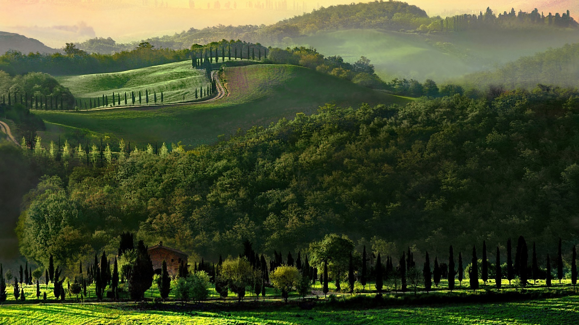 The image of the green forest of izosh on which the grass mountains and houses are located