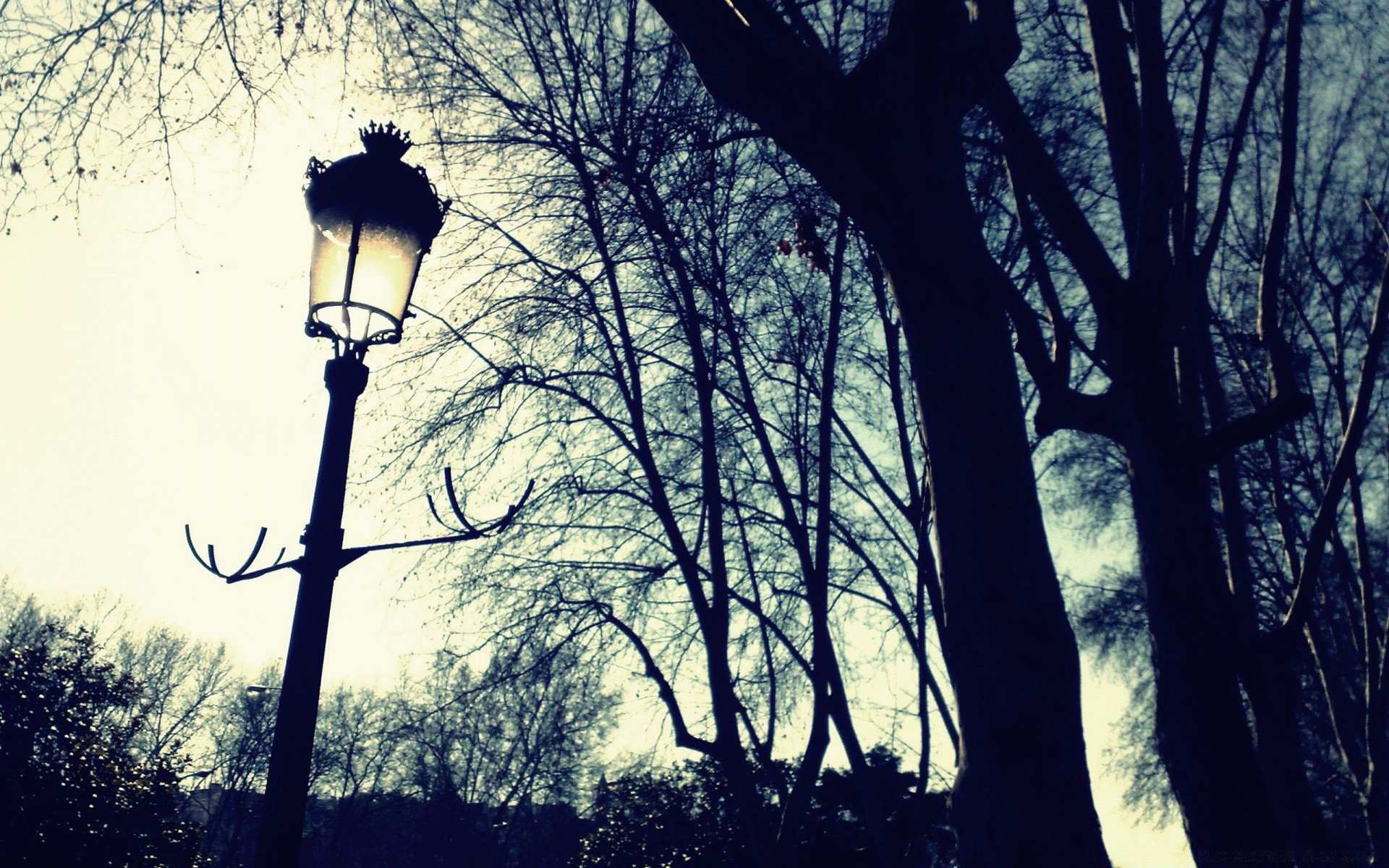 Lantern and silhouettes of trees against the sunset skyLantern and silhouettes of trees against the sunset sky