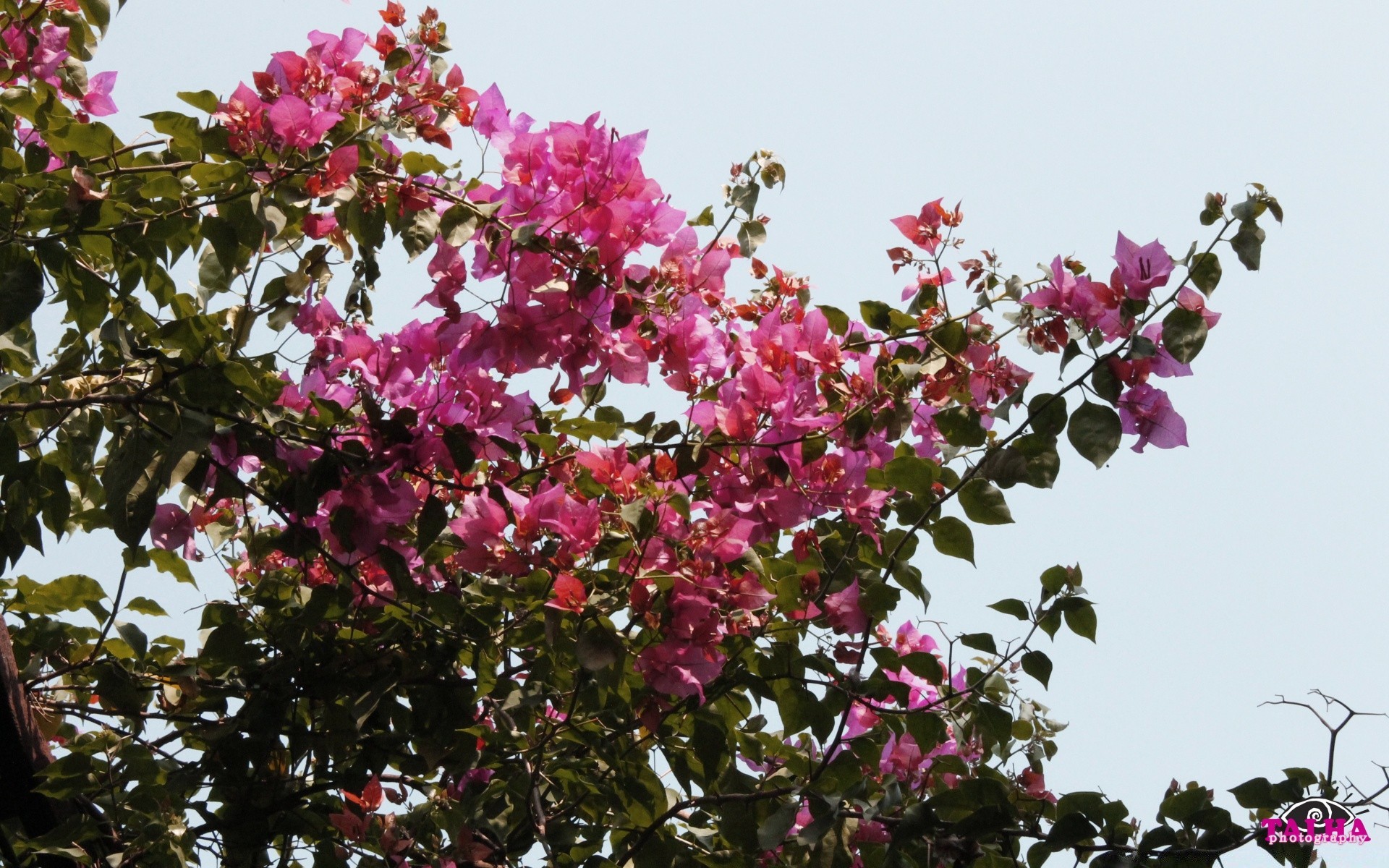 An overhanging thickly green tree branch
