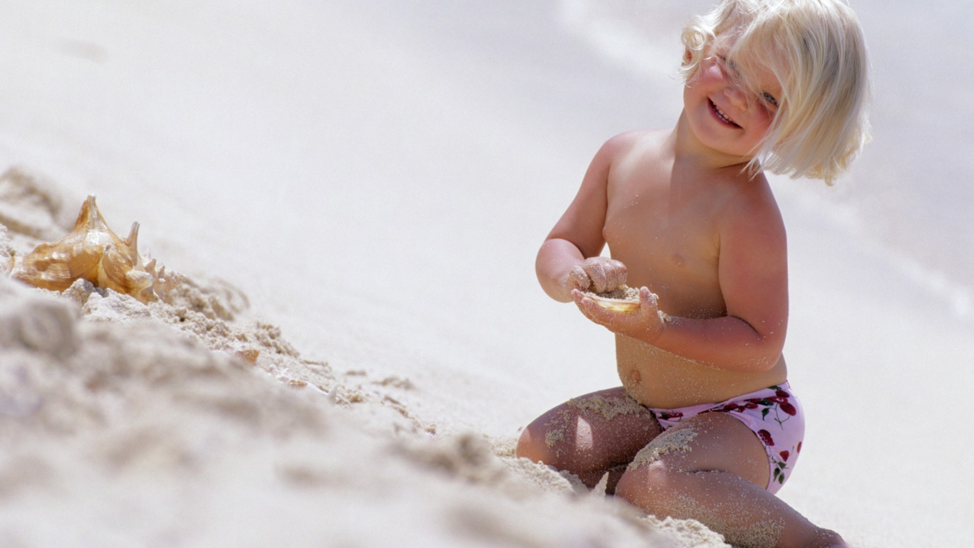 The child is sitting on the snow-white sand